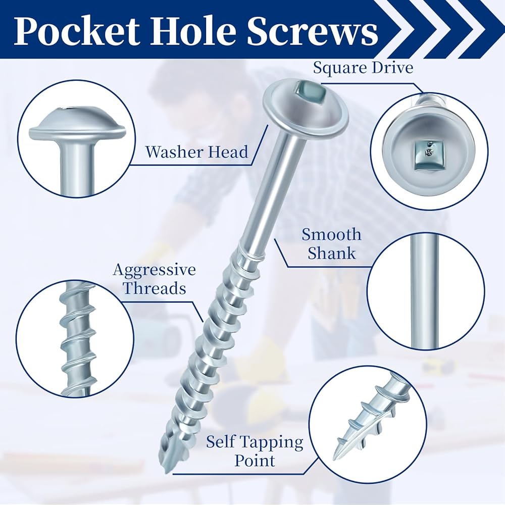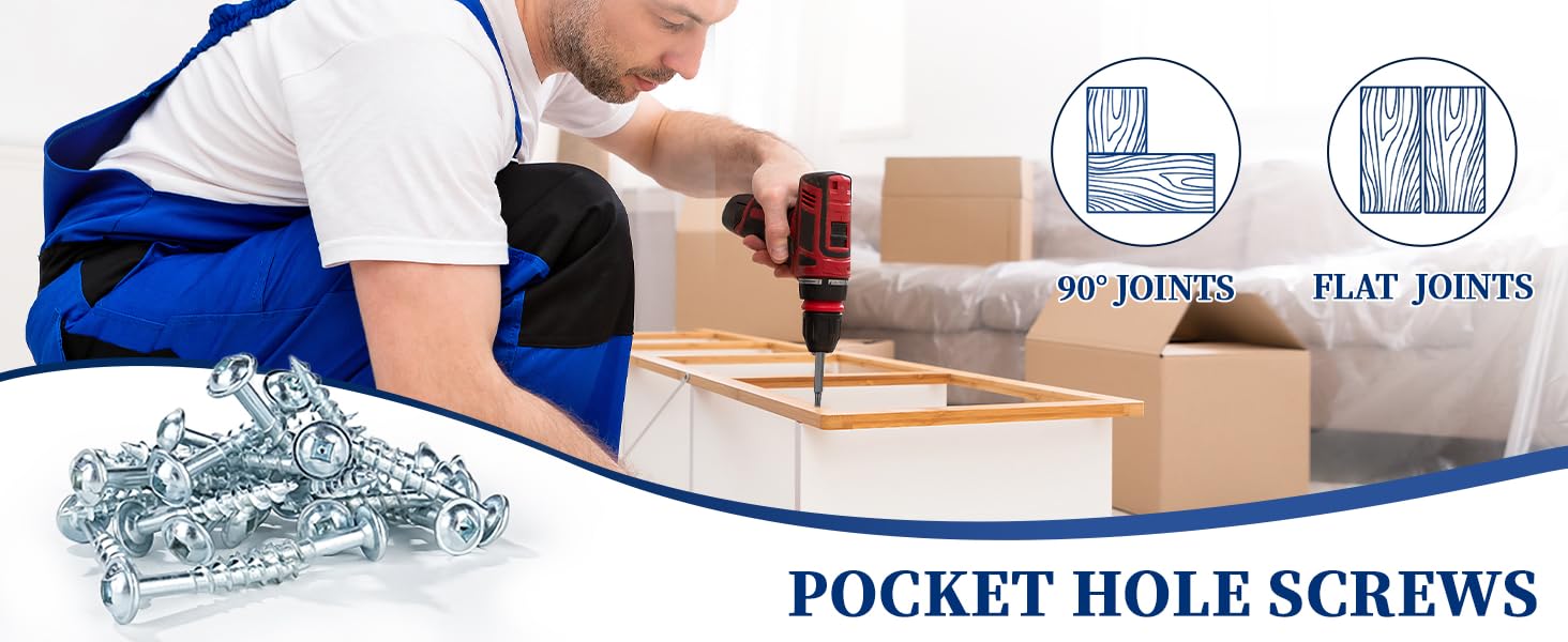 【Coarse thread+Self-Tapping Tip】: Pocket screws with sharp coarse threads and self-tapping point provide aggressive power when drilling, easily penetrate wood, resistant to warping and slipping. They are widely used in 90° wooden joints or Flat Joints for treated lumber, such as cabinet, table, bed and so on, pilot hole needed