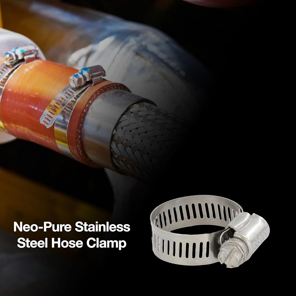 Neo-Pure 316 stainless steel hose clamps are designed for dependable hose and tubing connections in demanding environments. Each clamp is constructed from 316 stainless steel—band, housing, and screw—for strong, corrosion-resistant performance in marine, automotive, industrial, and farm-equipment applications.The worm-gear design delivers consistent clamping force around hoses and pipes for a secure fit, while the dual-drive hex/slotted screw allows convenient installation and adjustment using common tools. Select the correct clamp size range for your hose or tubing and tighten to the desired fit.