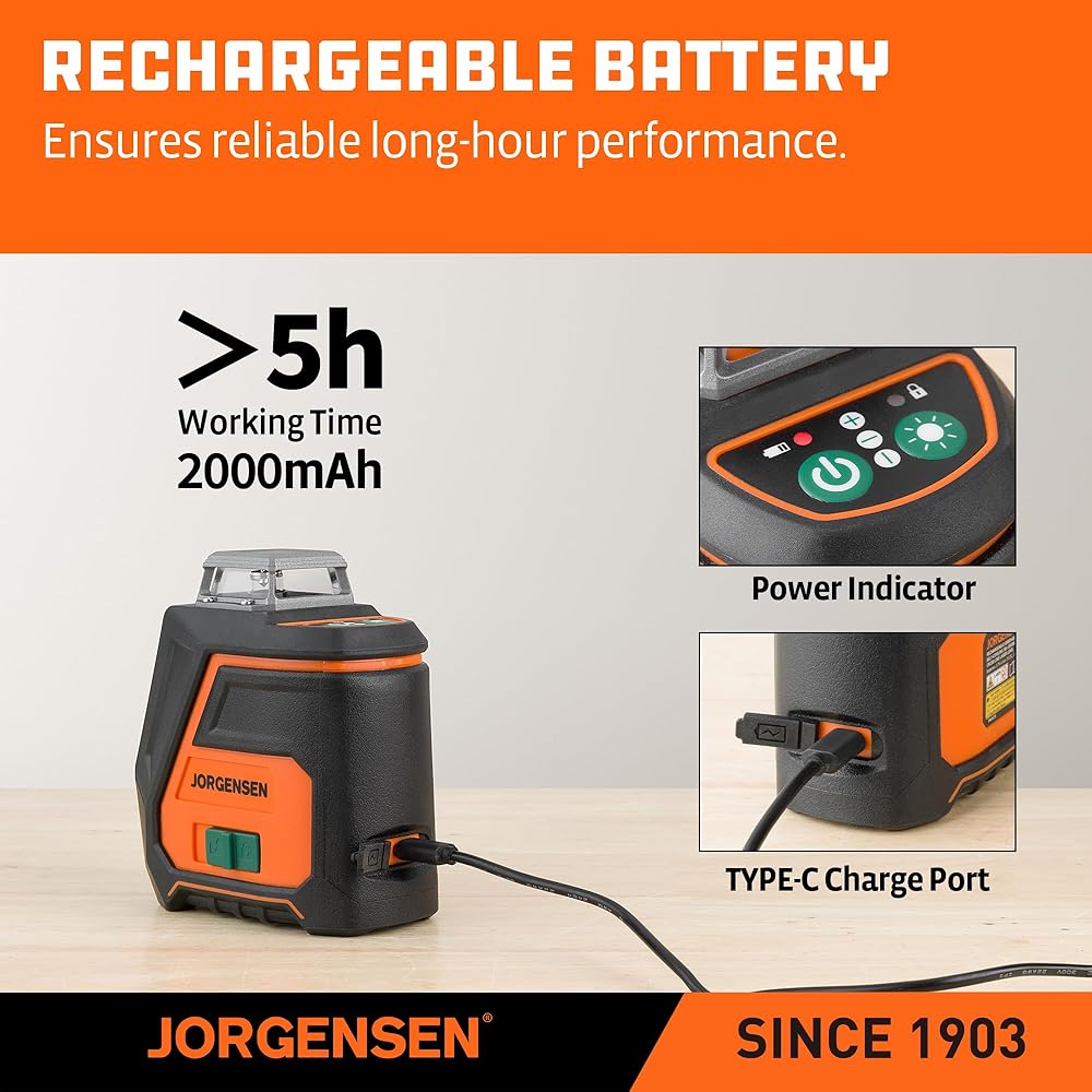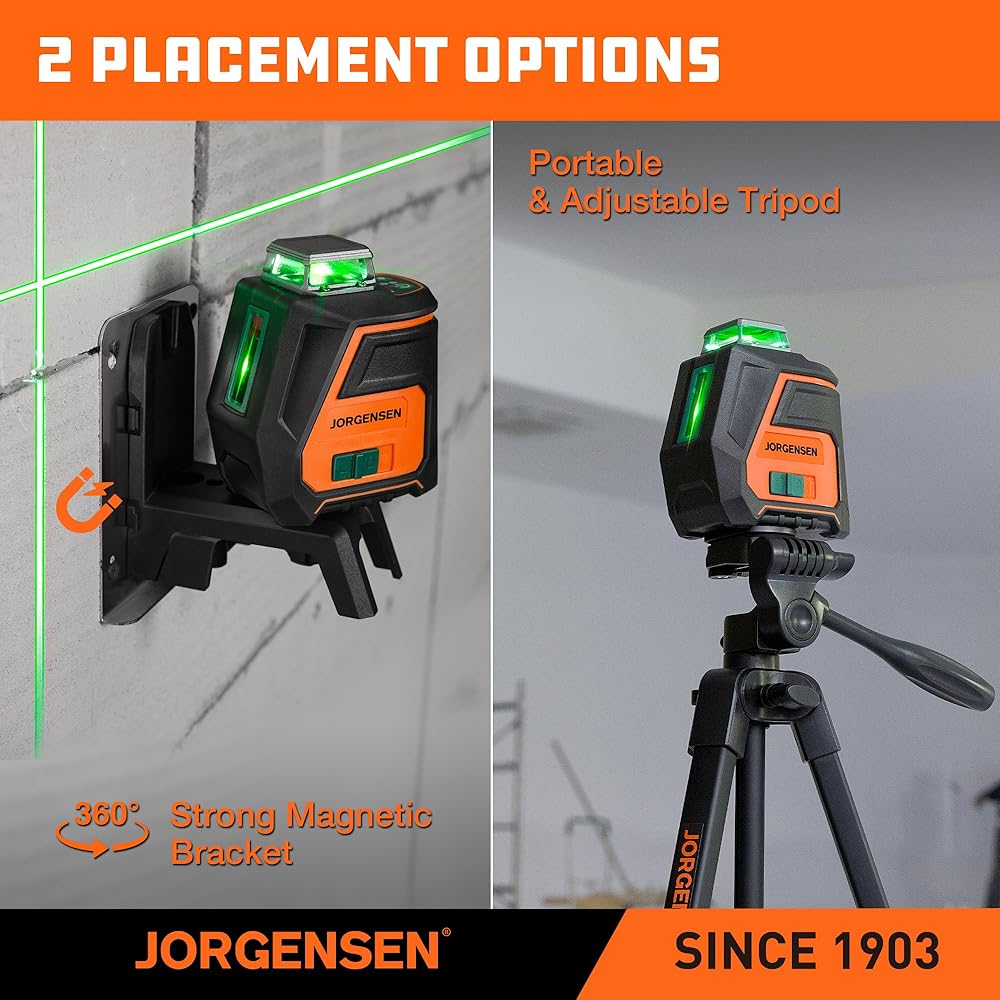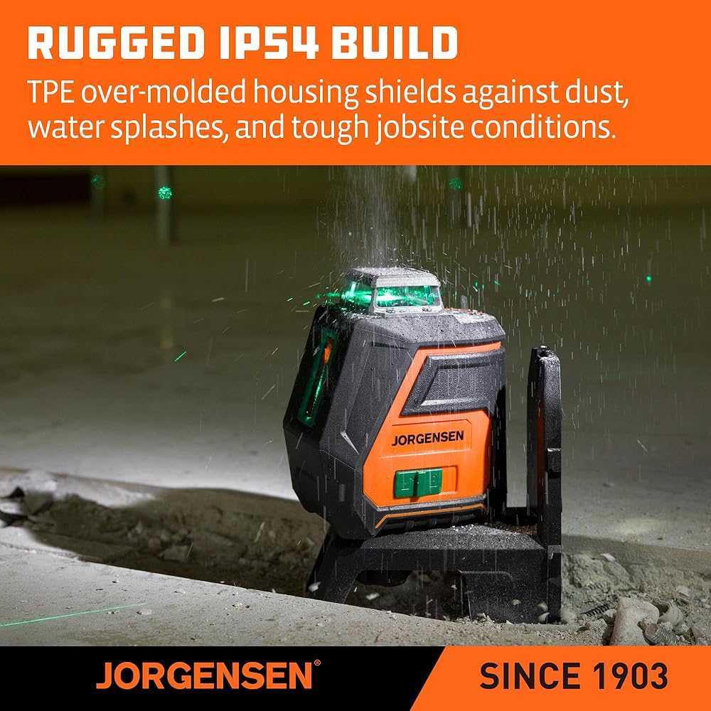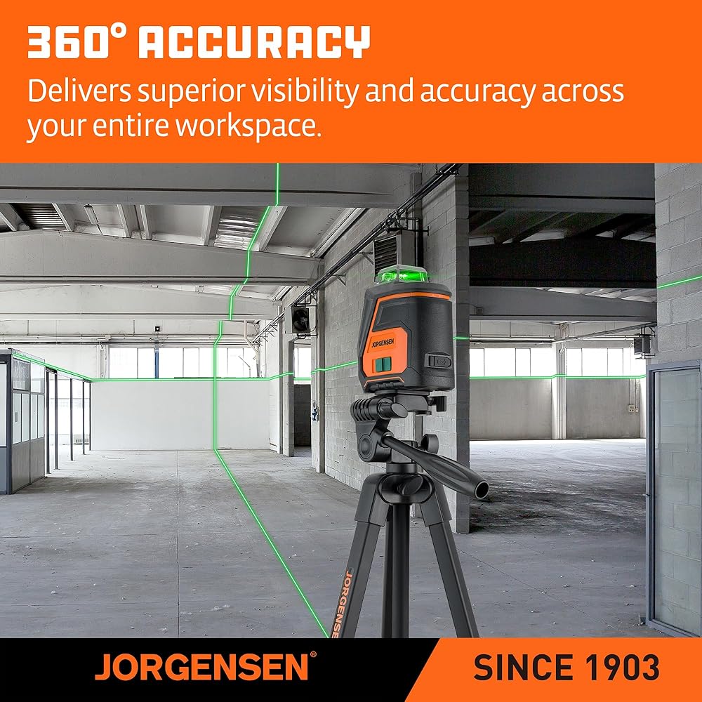 JORGENSEN 360° Laser Level with Tripod, 100 FT Rechargeable Self Leveling Cross Line Laser Leveler Tool with Magnetic Base, Wide Angle Green Laser Level for Picture Hanging, Floor Tile, Construction