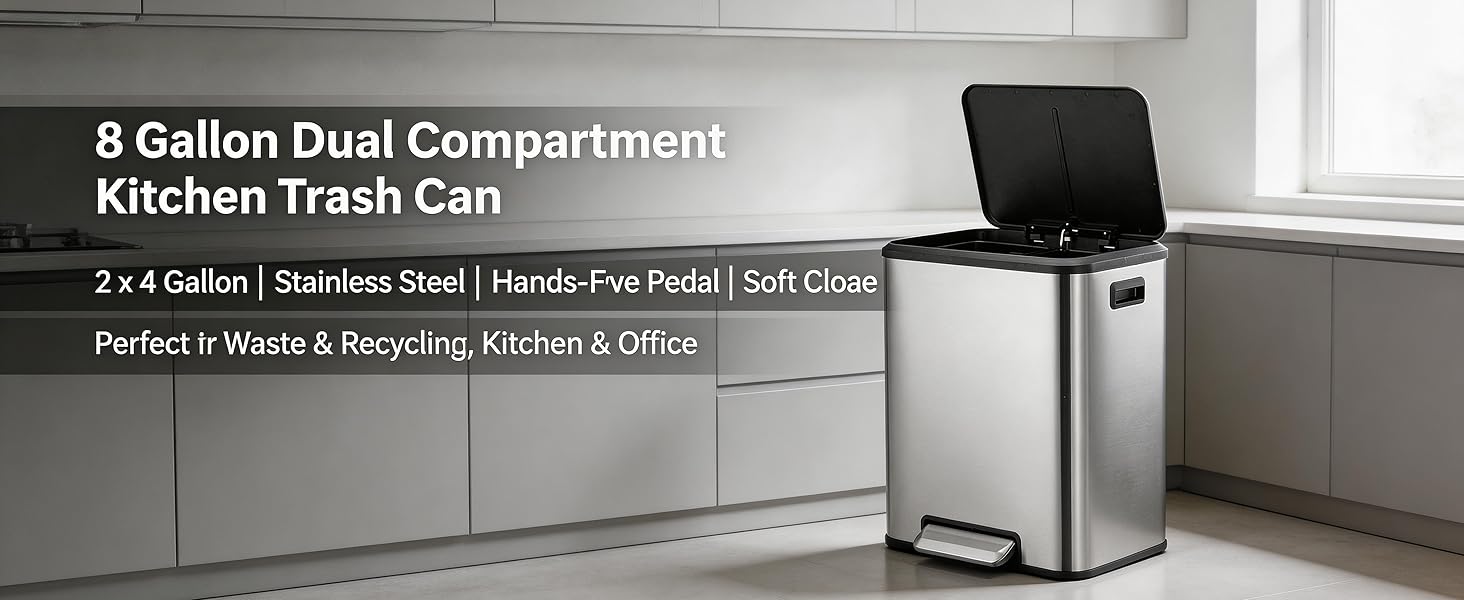 【Spacious Double Compartment Capacity】 With a total capacity of 8 gallons (2 x 4 gallons/30 liters), our double trash can provides ample space for both recyclable and non-recyclable waste. Each of the two removable inner buckets holds 4 gallons, allowing you to effectively sort your kitchen waste without frequent emptying.