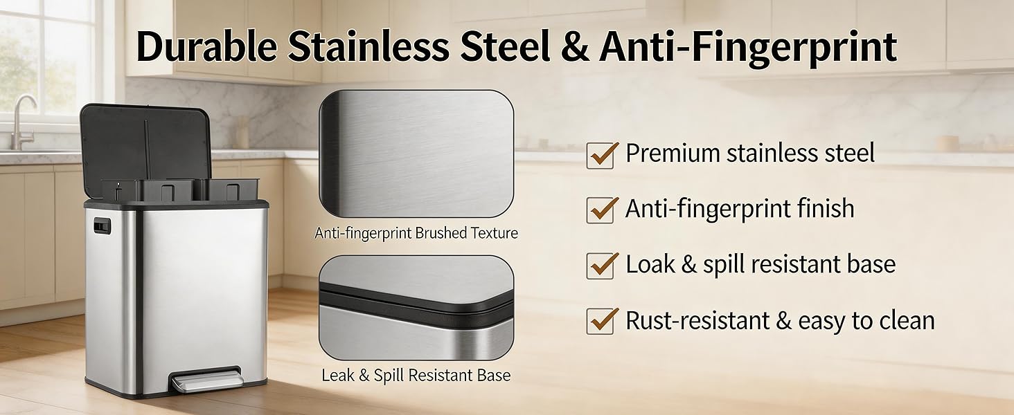【Durable & Practical Construction】 Made from premium fingerprint-proof stainless steel, this trash can combines durability with a sleek, modern appearance that complements any kitchen decor. The bottom seal design prevents garbage overflow and leaks, keeping your floor clean and free from spills.