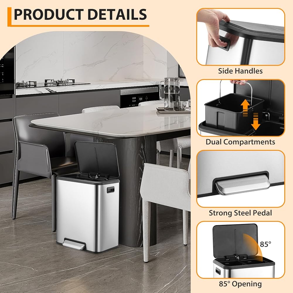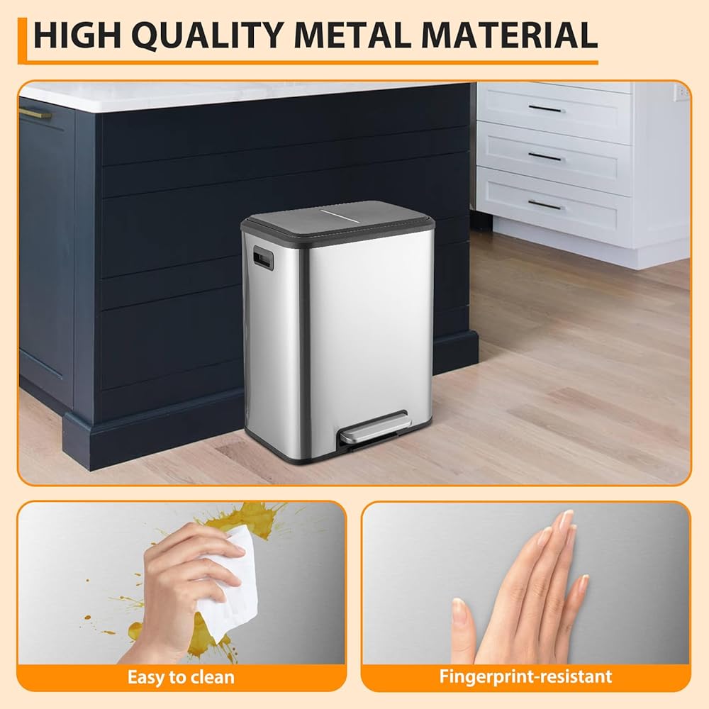 【Hands-Free & Sanitary Kitchen Trash Solution】 Our double trash can kitchen offers convenient hands-free operation with a sturdy steel pedal, eliminating the need to touch the lid with dirty hands. This garbage bin's dual recycling bins design allows you to easily separate wet and dry waste.