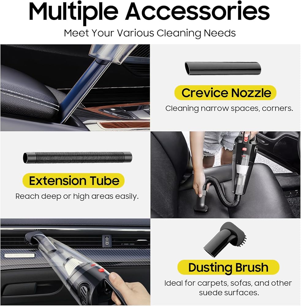 【Professional Attachments】This mini vacuum cleaner is equipped with 5 different attachments. The dusting brush nozzle helps agitate the surface dust, making it easier to be sucked into the vacuum, especially for cleaning dust, debris and hair; The crevice long nozzle used for cleaning narrow spaces, corners, furniture crevices, keyboards, and other hard-to-reach areas. The extension tube makes it easier to reach narrow or high areas, such as shelves or high-up dust.