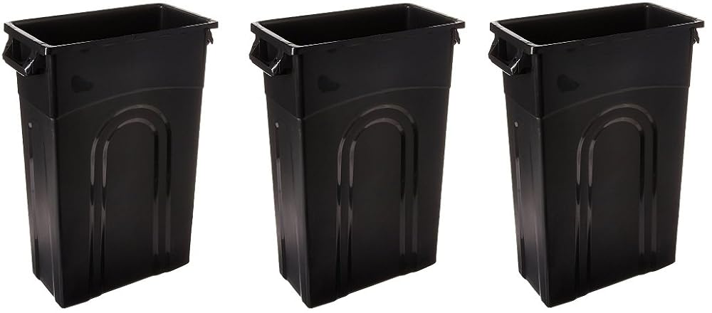 This container is ideal for tight spaces at home, in the office, or for recycling. The container has dual pass-through handles for easy transporting and a bottom hand groove for easier lifting and pouring. The bag cinch secures the liner in place, and when you are ready to remove the liner, the vented sides reduce the force needed to remove the bag. A dustpan edge is handy for quick clean-ups. A 33 gallon trash liner fits the container well. A 33 gallon bag is large enough to use the cinch and still reach the bottom of the barrel, but is not too large that there is a lot of excess bag.