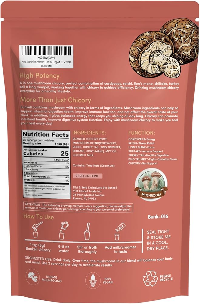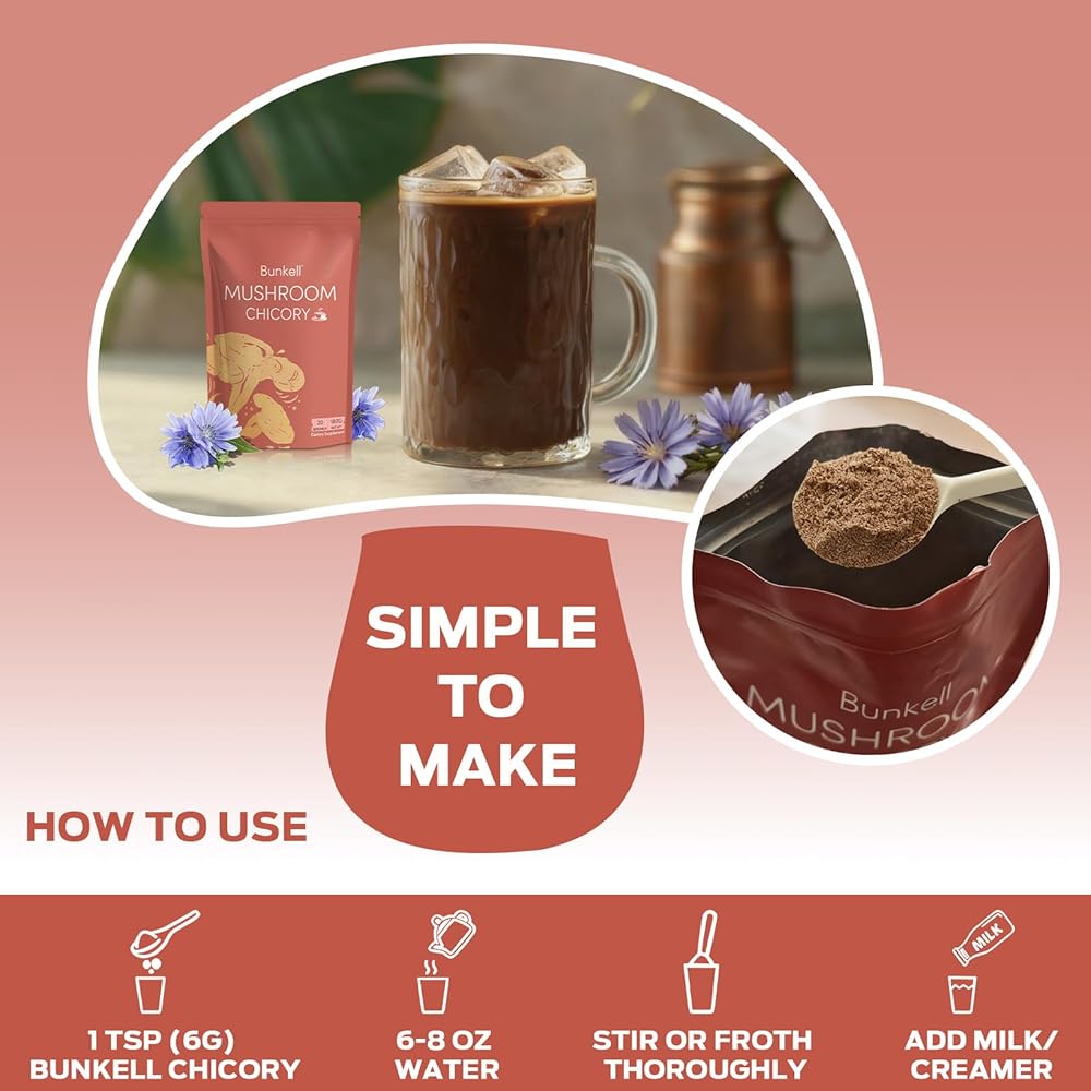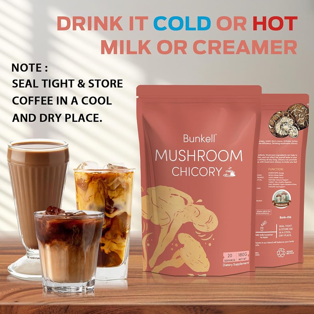 Easy to Brew: The form of Bunkell mushroom chicory is instant mushroom chicory powder, with a bitter taste of chicory root. Just take 1 tsp(6g) coffee per 6-8 fl. oz, add creamer or milk according to your preference; If you like ice or hot coffee, also add ice cubes or brew it with hot water. The natural mushroom ingredients are very suitable for vegetarians.
