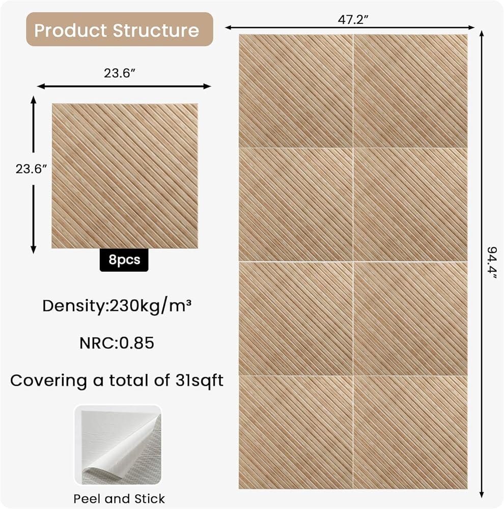 Acoustic Wall Panels, 8 pcs 23.6" x 23.6" – Wood-Pattern Polyester Fiber Sound Absorbing & Soundproof 3D Peel & Stick Panels for Recording Studio, Home Theater, Office, Meeting Room Décor (31 sq ft)