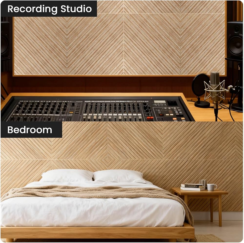 Transform any room into a professional-quality acoustic environment with this set of 8 wood-pattern acoustic wall panels, each measuring 23.6" x 23.6" for a total of 31 sq ft of sound-absorbing coverage. Designed for both functional sound control and stylish interior décor, these panels offer an ideal balance of noise reduction, echo control, and modern wall design—perfect for recording studios, home theaters, offices, meeting rooms, halls, gaming rooms, and more. Crafted from high-density polyester fiber, each panel delivers powerful sound absorption to reduce reverb, reflections, and unwanted background noise. Whether you're recording vocals, improving clarity in a conference room, or creating a more immersive home cinema experience, these panels help create a clean, controlled acoustic environment. The elegant wood-look finish offers a decorative, natural aesthetic that blends easily with modern, minimalist, rustic, and professional interior styles. These panels double as both acoustic treatments and functional wall art, transforming plain walls into premium accent features that enhance the overall atmosphere of your space. Installation is quick and effortless thanks to the peel & stick self-adhesive backing—just clean the wall, peel, and press. No drilling, no nails, and no special tools required. Ideal for renters or anyone seeking a fast, damage-free wall upgrade. Perfect for soundproofing, acoustic enhancement, and interior decoration, these panels elevate any environment where sound clarity and design matter. Use them to upgrade a recording studio, office meeting room, home theater, classroom, cinema room, or multimedia hall. Experience a quieter, cleaner, and more visually appealing space—all with a simple DIY installation.
