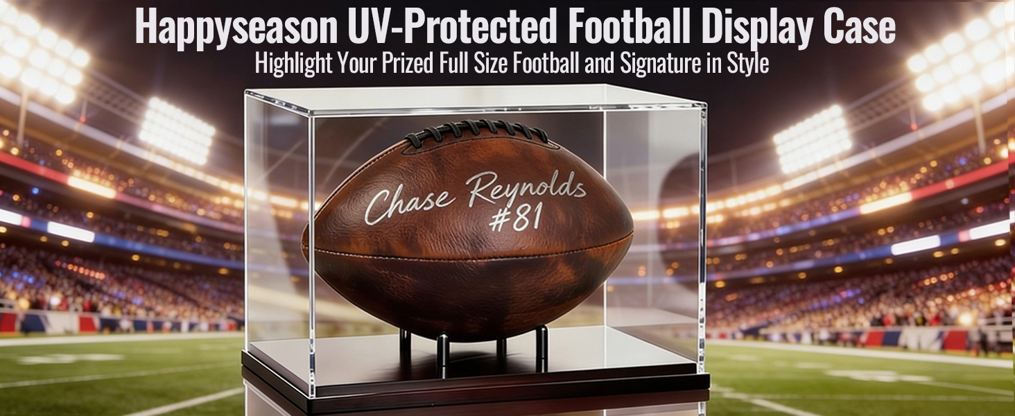 حافظة عرض كرة القدم Happyseason، تم اختبارها بواسطة SGS حماية من الأشعة فوق البنفسجية بنسبة 93.8% (الطيف الكامل 290-400 نانومتر)، قاعدة من الخشب الصلب، أوتاد فولاذية معدنية، حامل حامل كرة قدم موقع من الأكريليك، صندوق هدايا باللونين الأسود والذهبي