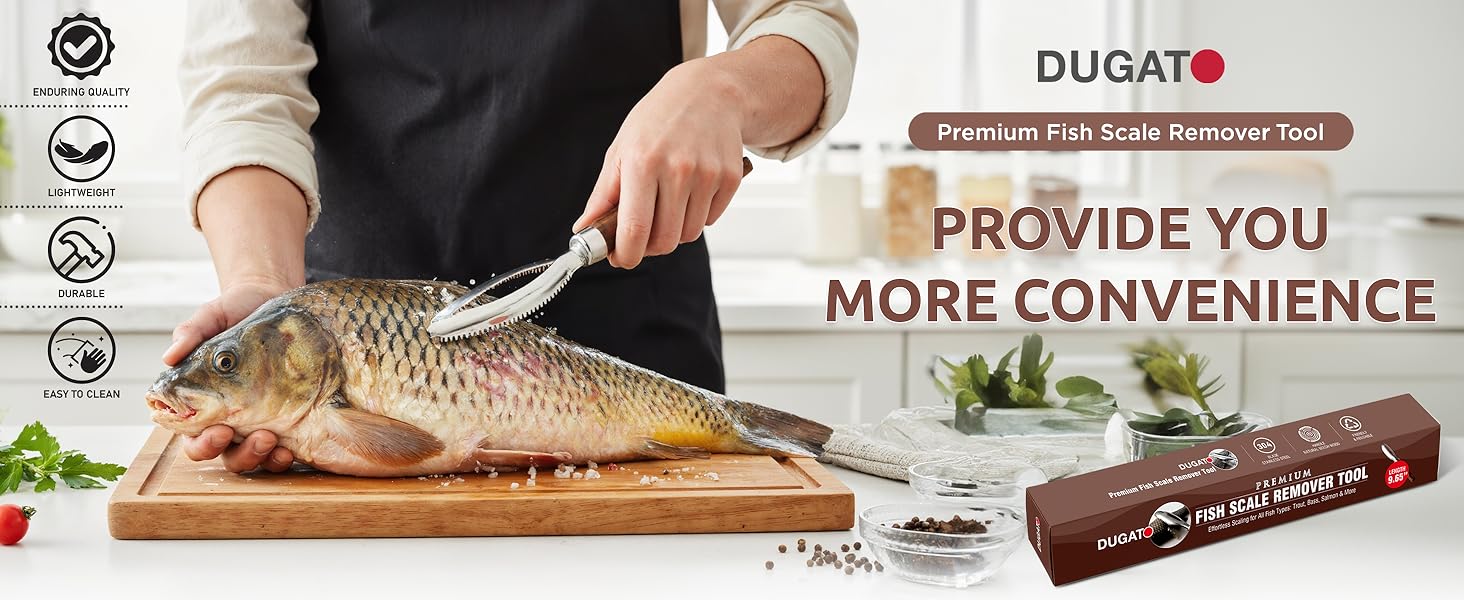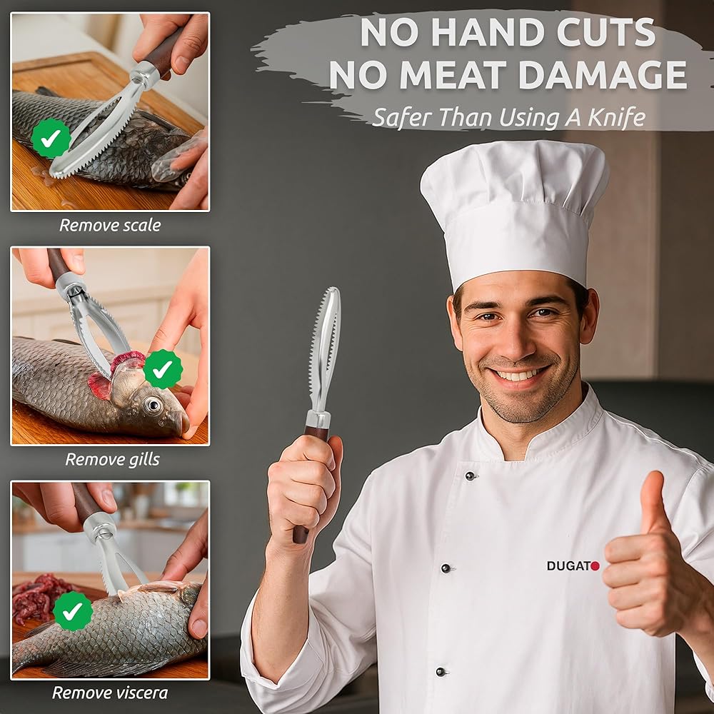 Dugato Fish Scale Remover Tool with Wooden Handle – Stainless Steel Fish Scaler Scraper for Quick & Easy Fish Cleaning – Rustproof Serrated Edge Seafood Descaling Tool for Kitchen & Outdoor Use