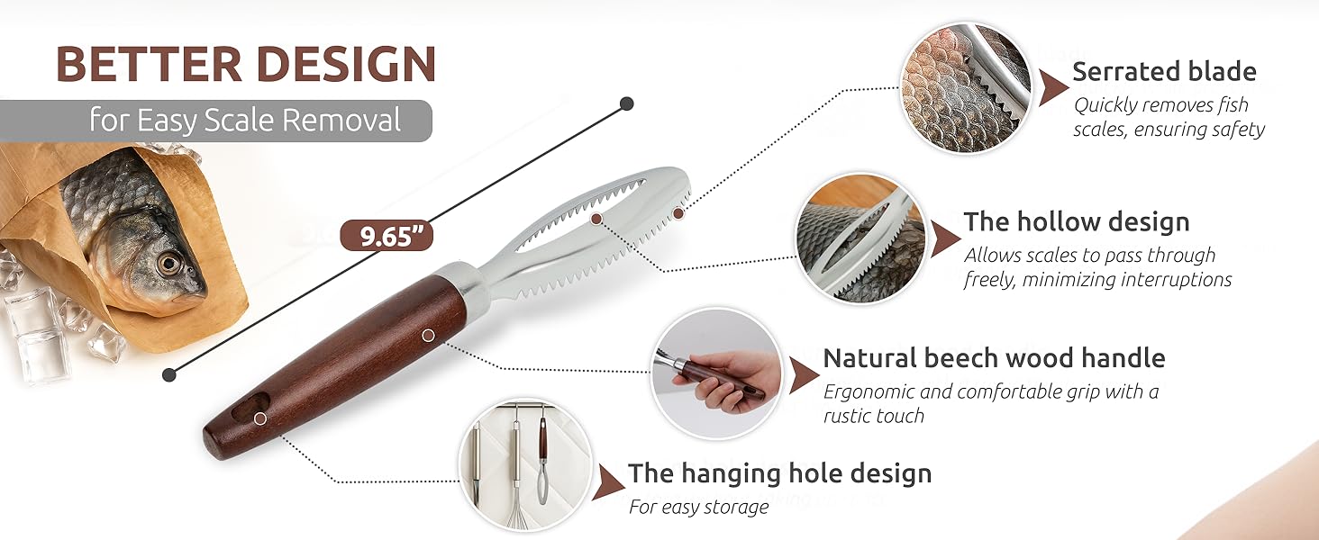 Comfortable Wooden Handle: Crafted with an ergonomic beech wood handle, this fish scaler scraper provides a secure grip. Its extended length minimizes wrist strain and hand fatigue, enabling you to clean fish comfortably and with enhanced control.