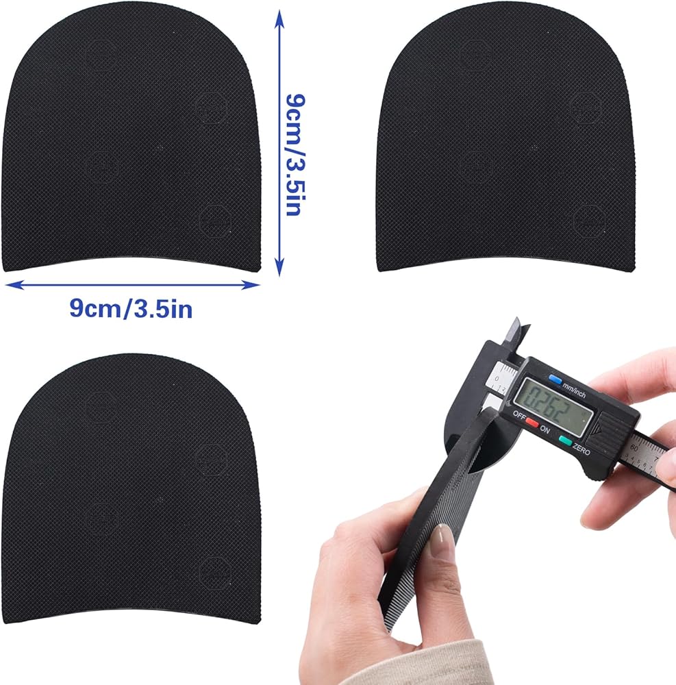 Size Details: Each rubber pad measures 3.46 x 3.74 inches and is 6 mm (1/4 inch) thick. These pads can easily be trimmed to fit various shoe sizes and shapes, offering a custom fit for boots, heels, dress shoes, and more