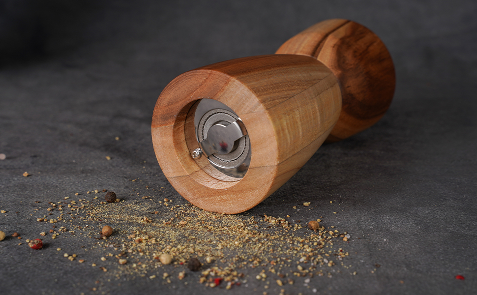 Pepper grinder blended with sturdy and beautiful rubberized wood grain. That adds a strong presence to the tabletop, kitchen or counter.