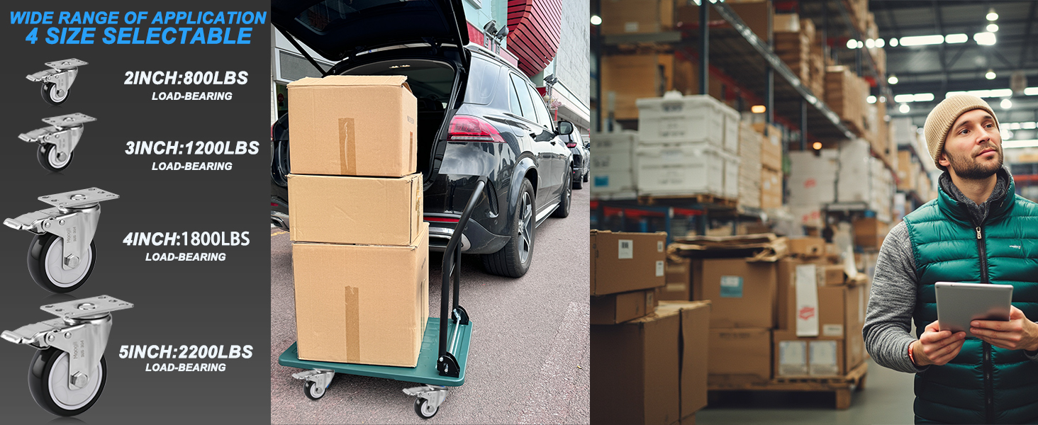 Extra Heavy Duty Load Capacity: This 3 inch casters have thickened stainless steel, polyethylene wheels, and double ball bearings. Capable of 1200 lbs(set of 4), they're strong and easy to assemble. rotate 360 degrees smoothly
