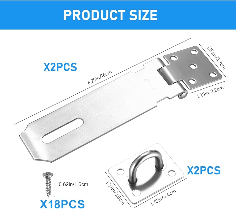 • Package Includes: You will receive 2 set door hasp latch locks(5 inch), with 18 fixing screws. If you encounter any problems or have any suggestions when using our door hasp, please contact us in time, and we will provide you with a satisfactory solution.