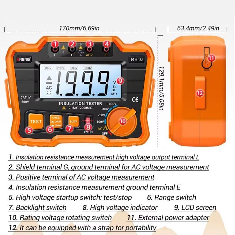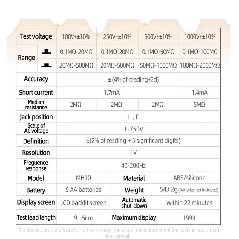 4.Measuring range MH10 is 0.1MΩ-1999MΩ, and the range is changed manually.