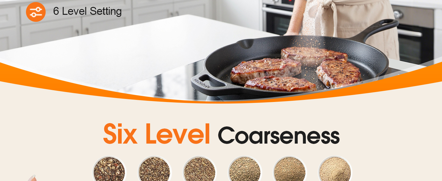6-Level Adjustable Grinding: Get precise seasoning by twisting the bottom portion of the grinder. With clearly visible gears marked by arrows, you can pick from 6 settings (Fine to Coarse)—ideal for fine pepper on steaks or textured salt for salads