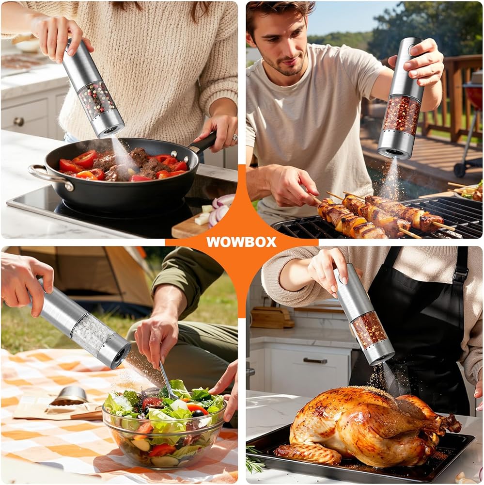 WOWBOX Electric Salt and Pepper Grinder Set 2 PCS, Stainless Steel Automatic Coarseness, Rechargeable Salt and Pepper Shakers, 95 L Large Capacity Multifunctional Pepper Mill, for Kitchen