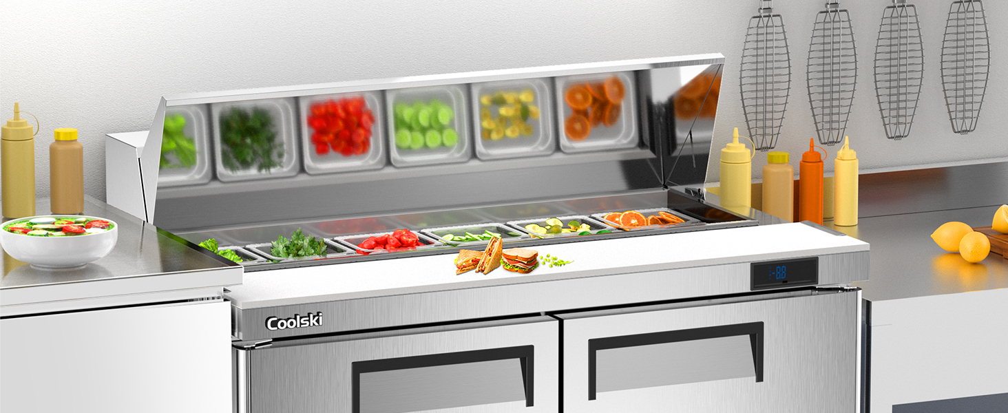 [Fast and Efficient Cooling] Coolski refrigerated prep table offers excellent cooling performance with its powerful compressor, R-290 refrigerant, and innovative air distribution system. It maintains NSF-7 temperatures even in high ambient temperatures, ensuring optimum freshness and safety. Its automatic defrost function also ensures optimal moisture management.