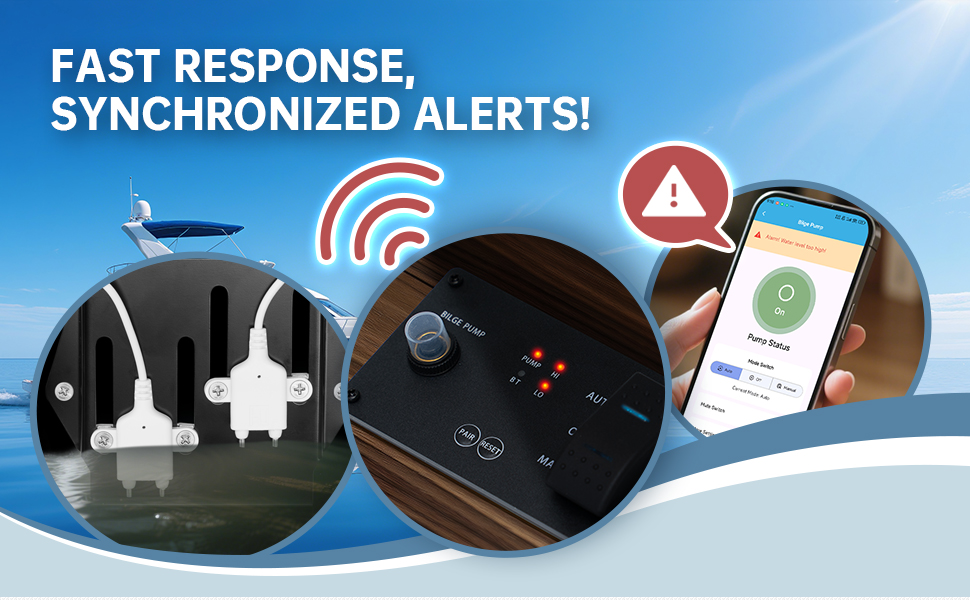 SMART MONITORING, ENHANCED SAFETY: Zuomeng Bluetooth bilge water level sensor kit integrates sensors and control panel seamlessly, syncing water level and pump status via App and panel. When water levels are abnormal, the panel triggers audible and visual alarms while the App sends instant alerts, making bilge management smarter and your vessel safer
