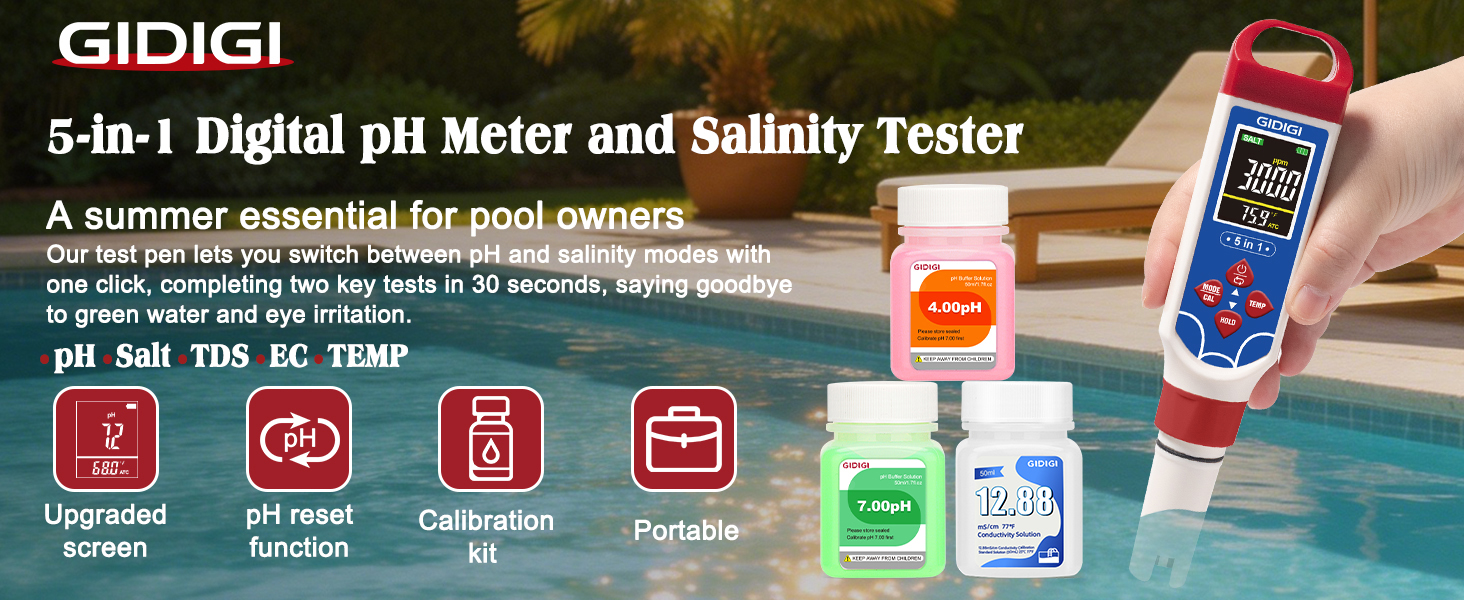 Calibration Accessories and Automatic Temperature Compensation (ATC): This GIDIGI water quality testing pen eliminates manual adjustments! The pool pH meter features built-in temperature compensation (32.1-140℉) and a calibration accessory set (pH calibration and 12.88 mS/cm calibration), ensuring laboratory-grade accuracy in brine pool and digital hot tub water testing applications. The included test kit and four extra AAA batteries significantly reduce your maintenance costs. Easy to operate: Simply immerse the probe of the 5-in-1 tester into pool water or a sample cup and observe the results.