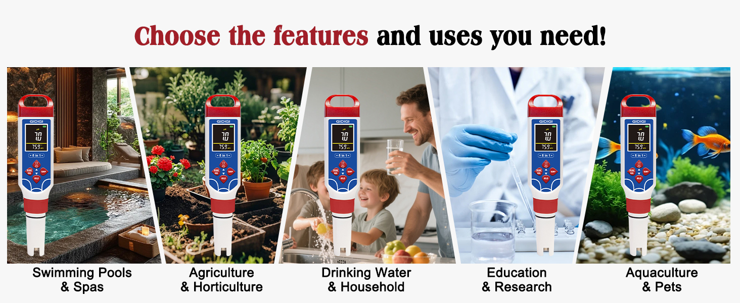 A versatile and multifunctional pH meter:Measures pH: 0-14, salinity: 0-100.0 ppt (automatic ppm/ppt switching), EC, TDS, and temp. Easily handles various liquids from freshwater to seawater, from kitchens to laboratories, meeting the testing needs of users in different scenarios: swimming pools, hot tubs, spas, marine aquariums, freshwater tanks, planted aquariums, hydroponic systems, soil irrigation, drinking water testing, reverse osmosis water purification systems, craft beer, homemade pickles, yogurt and cheese, formula preparation, coffee brewing, outdoor streams, pond ecosystem maintenance, aquaculture, commercial greenhouses, laboratories, and food processing.