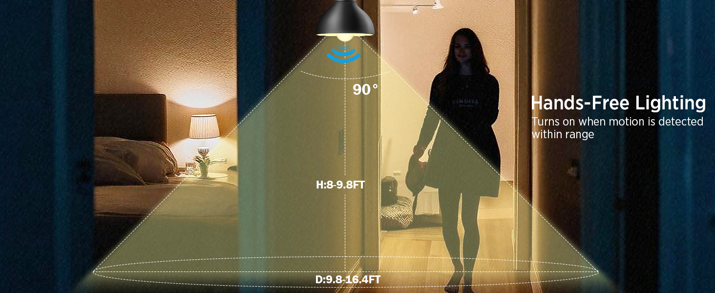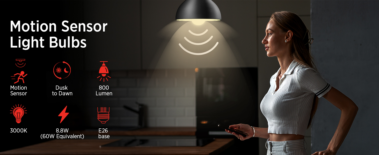 【Energy Efficient & Long Lasting】This 8.8W LED motion light bulb delivers 800 lumens of brightness (equivalent to a 60W incandescent bulb) while saving up to 85% on energy costs. Designed for long-lasting performance, it provides up to 15000 hours of reliable use.