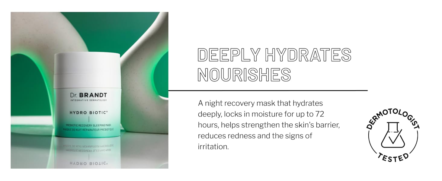 BALANCE THE SKINSANITY - Hydro Biotic is a nighttime mask that hydrates deeply, locks in moisture for up to 72 hours, helps strengthen the skin's barrier, and reduces redness and signs of irritation.