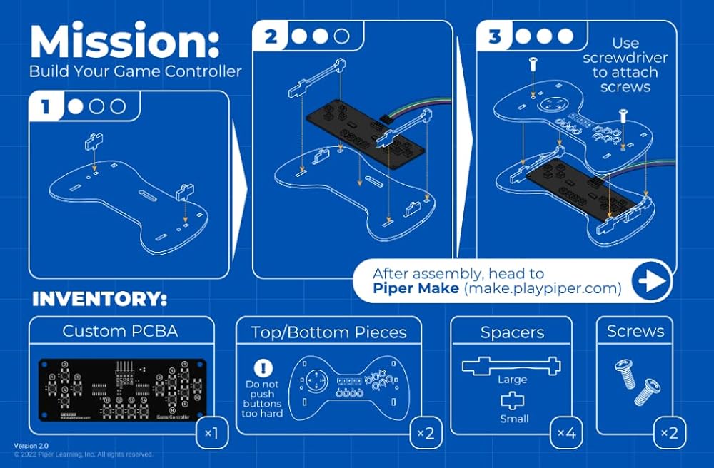Turn curiosity into confidence with the Piper Make Game Controller a DIY STEM kit where kids ages 8+ build, code, and play with a controller they make themselves. Starting with laser-cut wood pieces, jumper wires, brass hardware, and a custom printed circuit board, learners assemble their own hardware project step by step. Once built, they bring it to life by coding through the Piper Make platform, gaining firsthand experience in how hardware and software work together. After coding, kids test their creation with seven exciting mini-games in Pip's Arcade — or map their controller to Minecraft Education Edition for an even deeper adventure. Perfect for both families and educators, the Piper Make Game Controller blends play and education seamlessly. At home, it makes an unforgettable STEM gift that sparks hours of learning and fun. In classrooms, clubs, or makerspaces, it helps students explore circuitry, coding, collaboration, and creativity in an interactive way. Requires the Piper Make Base Station with Raspberry Pi Pico (sold separately).