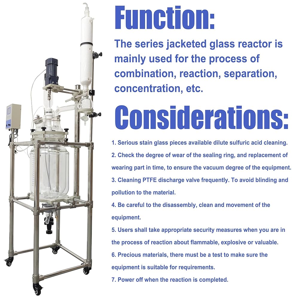 • [PREMIUM MATERIAL]This chemical glass reactor adopts premium stainless steel support frame. And the glass reactor is with long-lasting borosilicate glass which is with uniform thickness with good performance in physical and chemical properties and has high heat resistance and strong impact resistance. So it is long-lasting and easy to clean