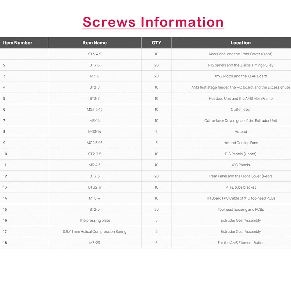 Replacesment Screws Kit Compatible with Bambo Lab X1 X1C P1S P1P Series and AMS, Assortment of 3D Printer Screws