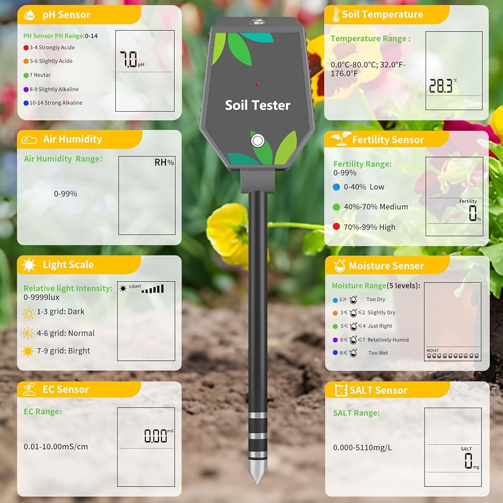 Soil Moisture Meter for Plants, 8-in-1 Soil pH Meter Moisture, Light, pH, EC, Fertility, Salt, Temp, Air Humidity, Soil pH Test Kit Great for Garden, Lawn, Farm, Indoor & Outdoor Use