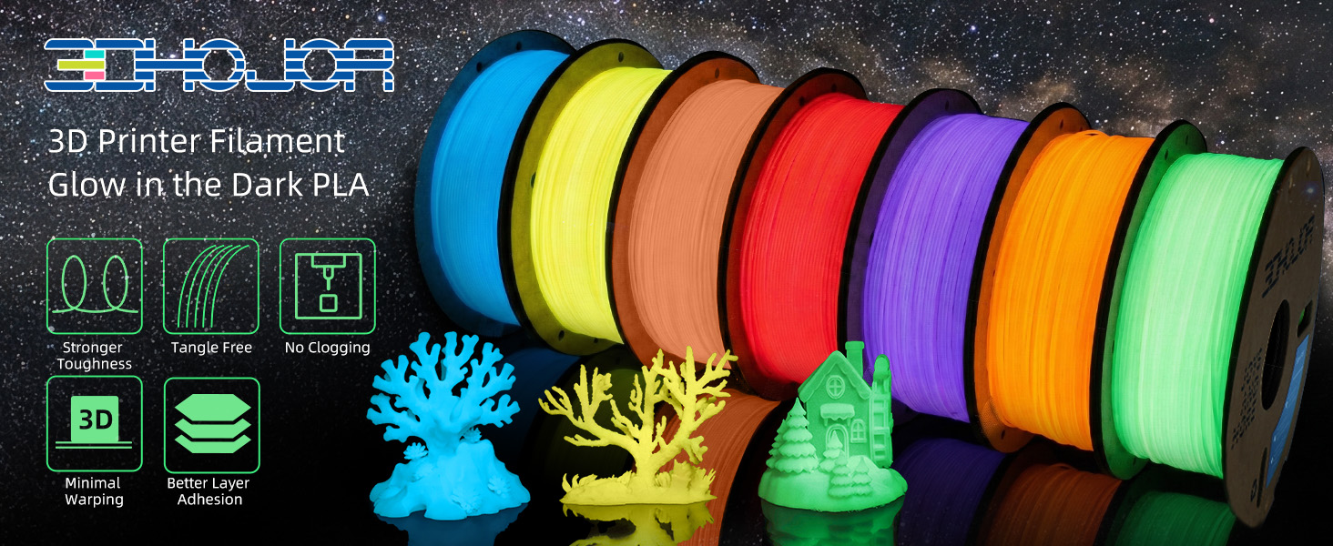 【Glow-in-the-Dark】Get amazing glow effects with every print. Made with premium phosphorescent materials, 3DHoJor Glow-in-the-Dark PLA filament quickly absorbs UV or natural light and shines brilliantly in the dark. For the brightest glow, just put it under direct sunlight or a UV lamp for a few minutes. Ideal for standout decorations, toys, safety markers, and more—fun by day, glowing by night!