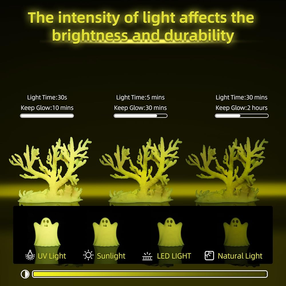 【Endless Creative Possibilities】Smooth finish in normal light and a magical glow in the dark, this filament is perfect for artistic creations, kids' toys, and seasonal decorations like Halloween props or Christmas ornaments. It also adds a fun, safety-enhancing element to outdoor gear and low-light visibility items. Please avoid prolonged exposure to sunlight, as it may cause brittleness and fading.