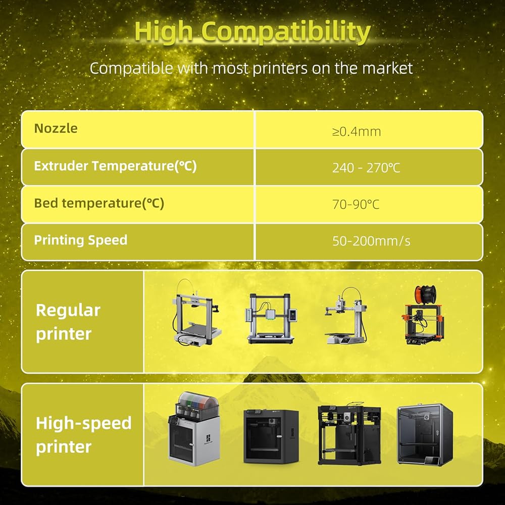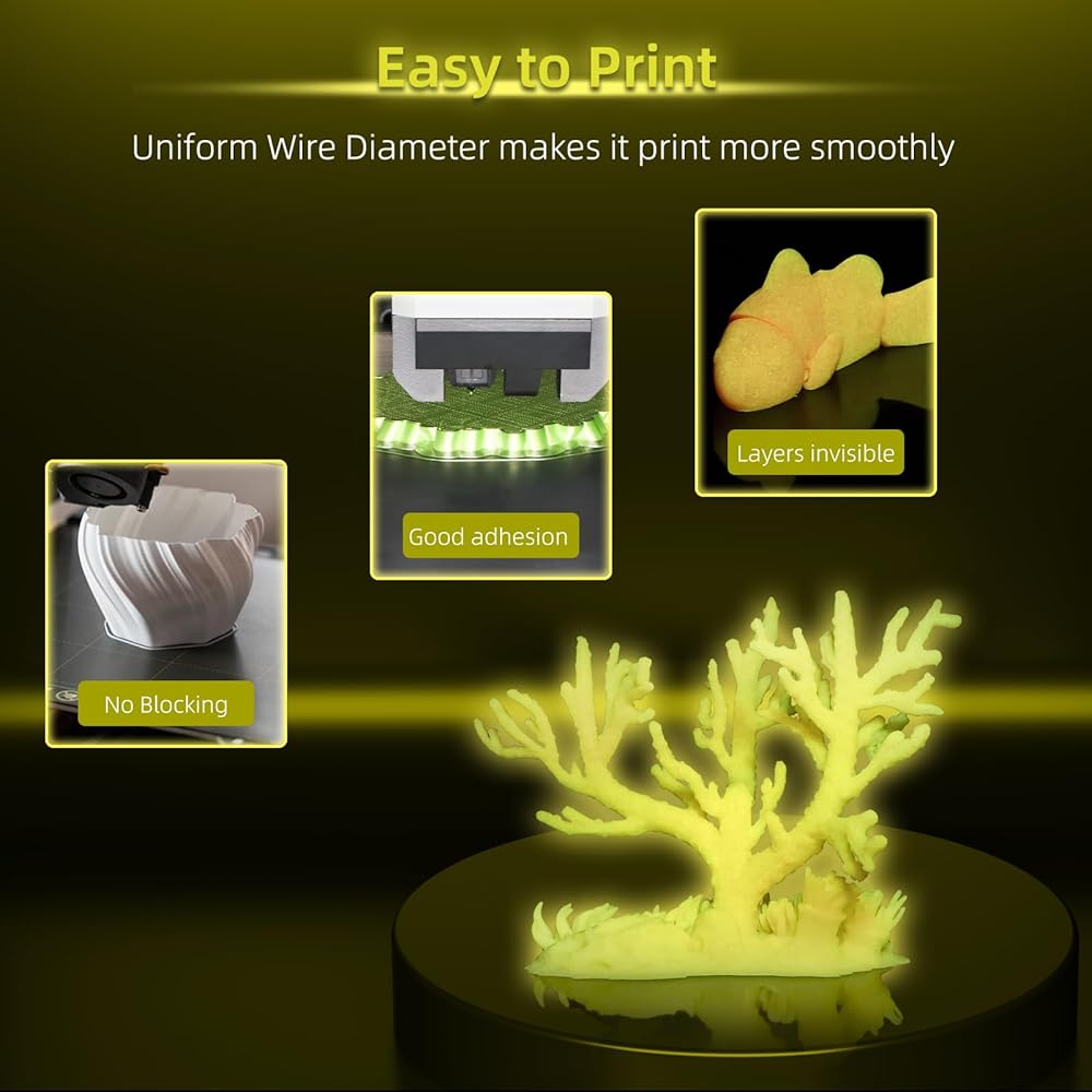 【Dimensional Accuracy &Wide Compatibility】Consistent quality means successful prints every time. Our Glow PLA filament boasts a precise diameter tolerance of ±0.03mm, ensuring smooth feeding and reliable extrusion with minimal adjustments. It's compatible with most FDM 3D printers, including Bambu Lab, Creality, Prusa, Anycubic, and more. Note: For best results and to extend nozzle life, a hardened steel nozzle is recommended due to the mild abrasiveness of glow pigments.