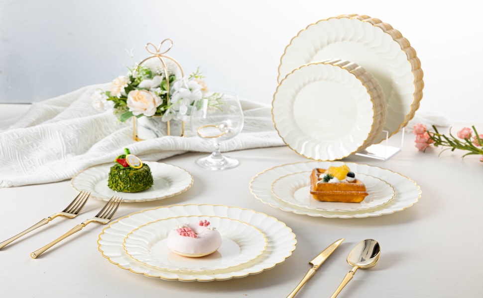 HEALTHY MATERIAL & STURDY: These ivory plastic dessert plates for weddings are made of 100% food grade plastic and non-toxic. These disposable plates are solid, durable and heavy duty which won't scratch or break easily