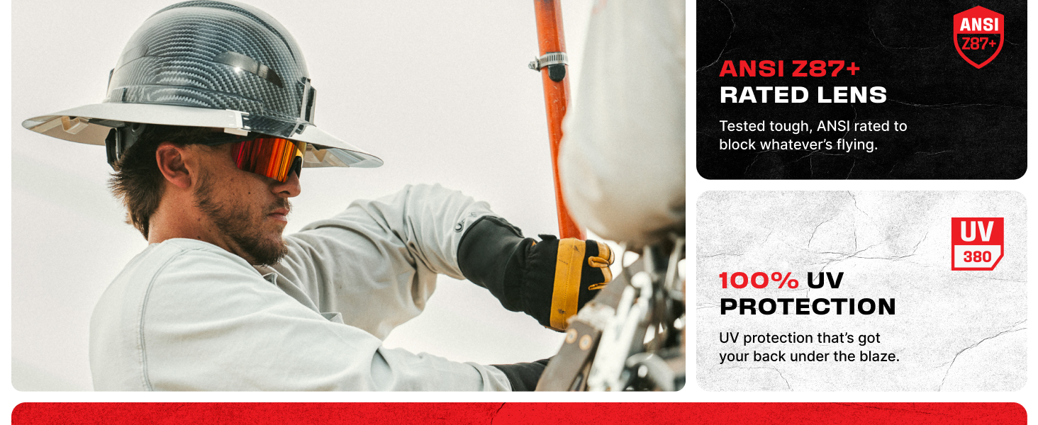 BUILT TO LAST — Best safety glasses for work, made to survive drops, knocks, and flying whatever. These tough polycarbonate safety sunglasses for men are made from shatterproof polycarbonate and come backed with a lifetime warranty — because we stand by our gear.