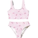 متعددة الاستخدامات لأي نشاط صيفي. مثالي لدروس السباحة أو العطلات الاستوائية أو حفلات حوض السباحة في الفناء الخلفي، يمكن دمج هذا البيكيني بسهولة مع أغطية وصنادل. تضيف الطباعة المرحة أسلوبًا فوريًا إلى أي يوم صيفي.