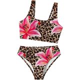 طباعة الفهد جريئة مع لهجة الأزهار. يتميز هذا البيكيني للفتيات بطبعة جلد الفهد الشرسة المغطاة برسومات زهور كبيرة الحجم لإضفاء لمسة ممتعة ومواكبة للموضة. يظل التصميم عالي الدقة نابضًا بالحياة بعد السباحة، مما يجعلها مميزة في حمام السباحة أو الشاطئ.