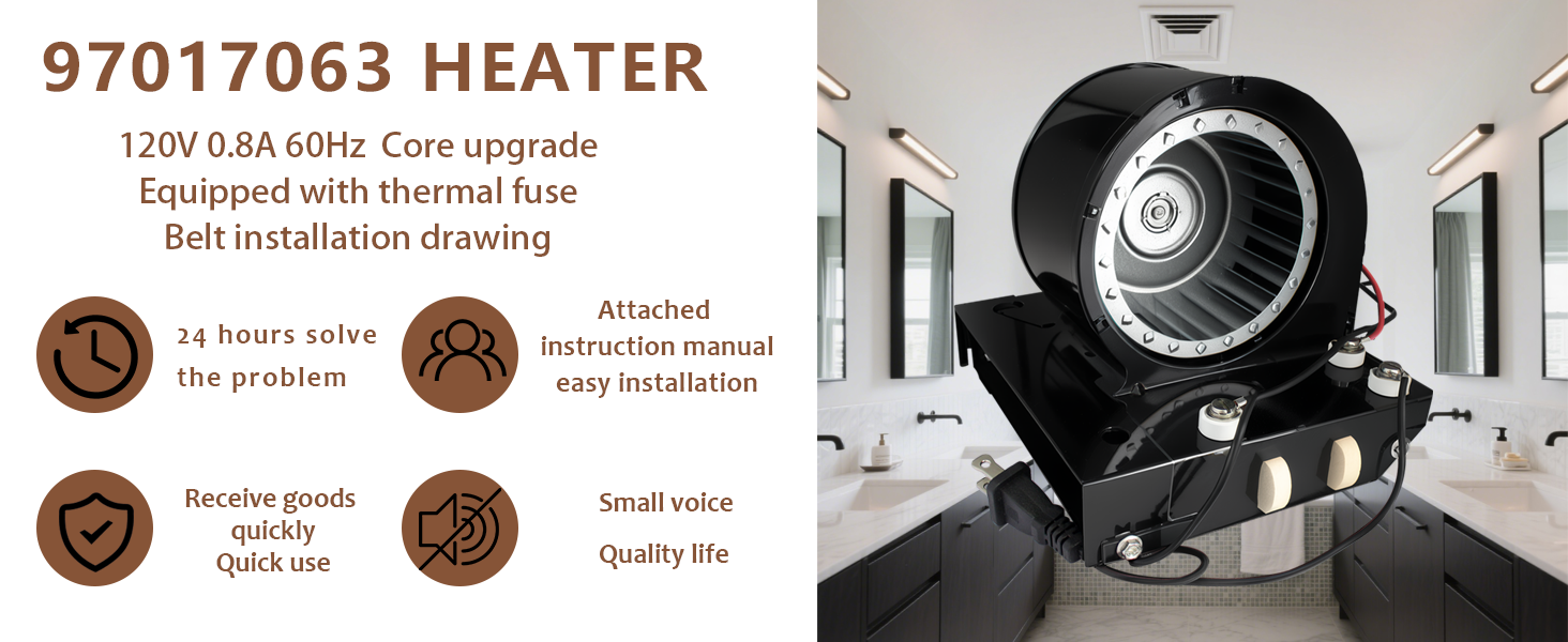 S97017063 heater motor specification: 120V, 0.8A, 60Hz, 2800 rpm. S97017063 motor assembly, including heater motor, blower impeller, assembly, thermal fuse, volute and hardware, is specially designed for your Broan 659 695 bathroom exhaust heating fan, which can be used in high humidity environment and can be installed in a compatible Broan NuTone bathroom exhaust fan at any time.