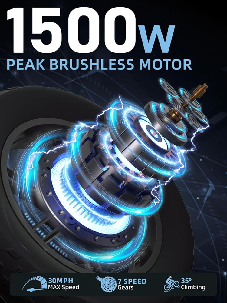 【1500W Peak Power Hub Motor & 30° Hill Climbing】Experience high-performance electric bicycle riding with our upgraded 1500W peak brushless hub motor—reach speeds up to 30 MPH in all-electric mode and conquer slopes up to 30°. Equipped with a versatile 7-speed gear system, this e-bike effortlessly handles city commutes and rough off-road trails alike