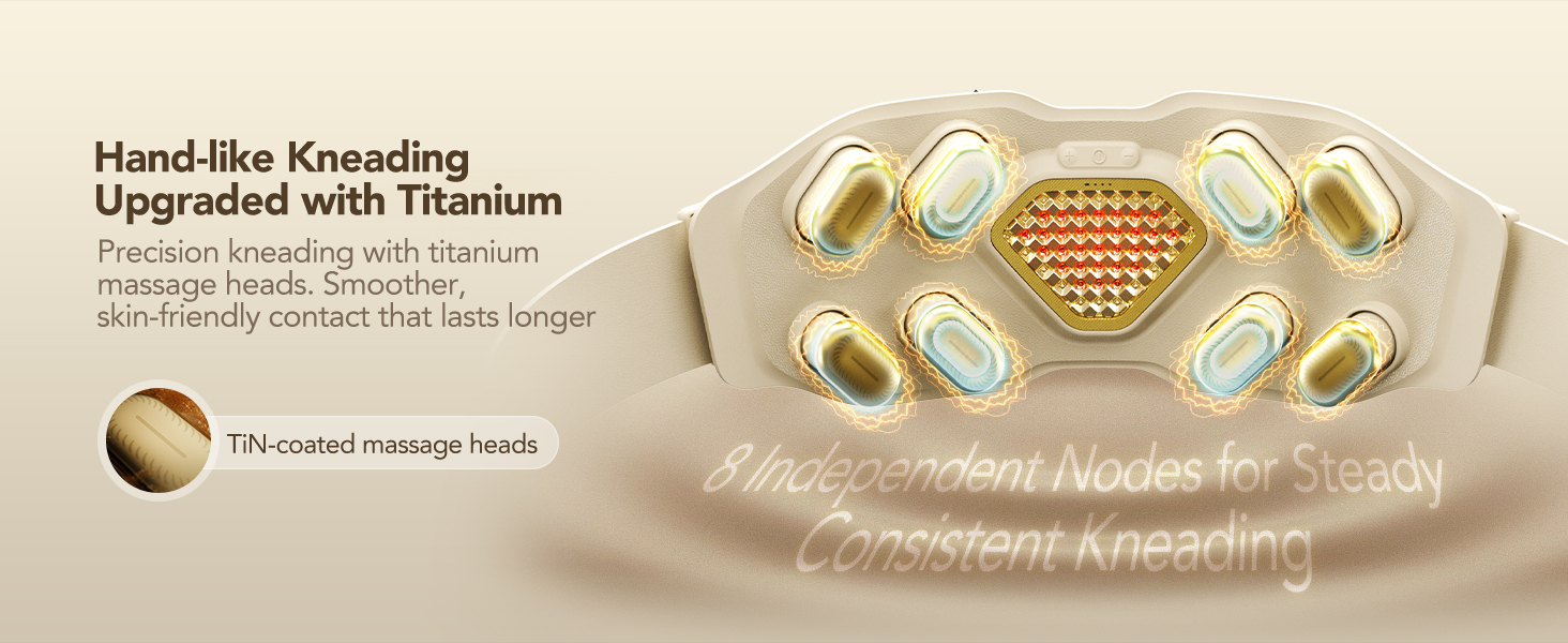 Titanium-Coated Lower Back Massager — Unlike back massagers using plastic or rubber nodes, the W9 Ultra features 8 TiN-coated titanium heads for smoother, skin-friendly contact that lasts longer. Combined with 3,000-speed rhythmic kneading modulation, each node mimics real hand pressure deep into lumbar muscles for a layered, immersive relief experience. Best used directly against skin or over thin clothing.
