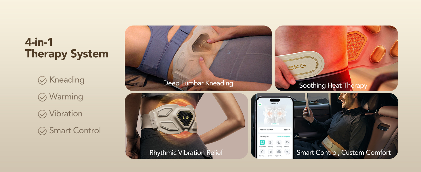 8-in-1 Lower Back Massager Belt — The SKG W9 Ultra combines targeted kneading, 850nm NIR warming, mid-frequency rhythm modulation, and app-guided smart control in one wearable belt. The upgraded Φ12 motor delivers +20% deeper kneading force than the previous generation — no more switching between multiple devices for full lower back relief. Fits waist 23"–47". Tip: First-time users may feel mild tingling at lower intensities — this is normal and fades quickly.