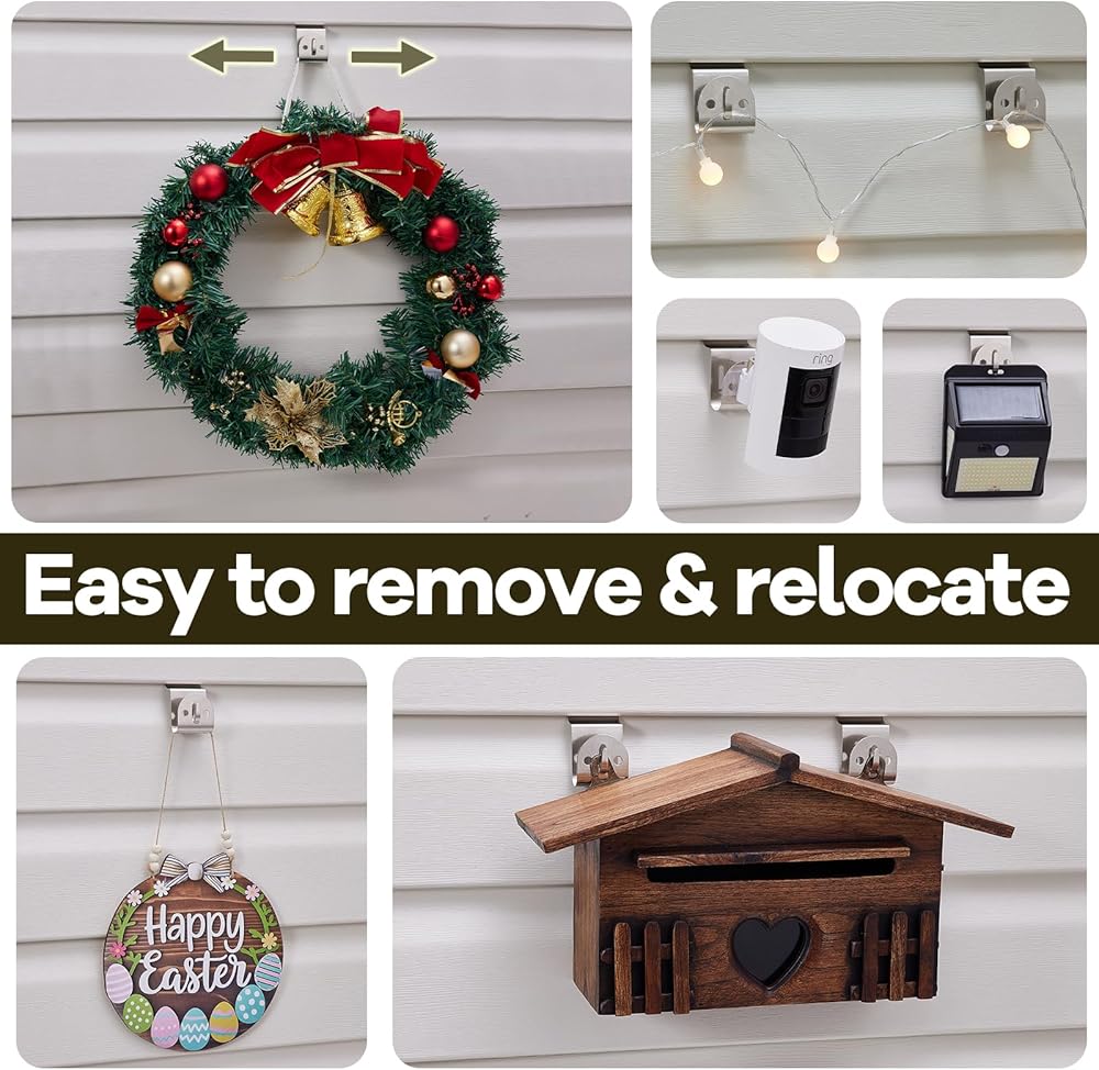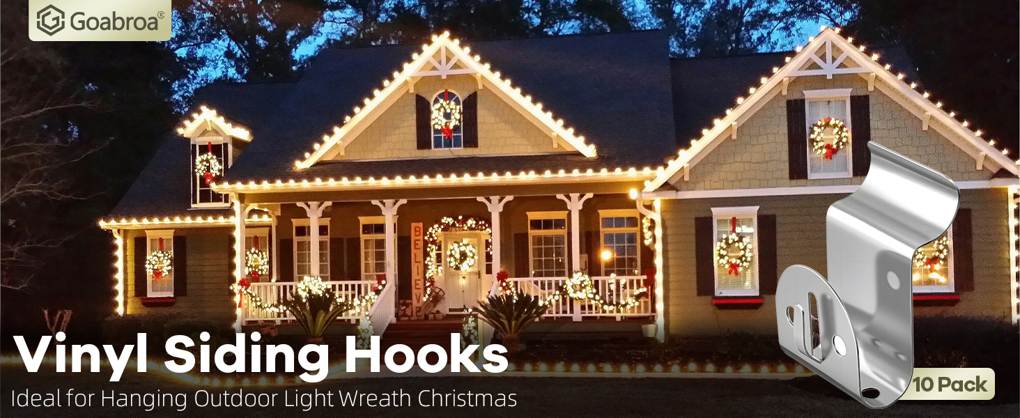 Decorate Your Home: 10-piece set of no-drill vinyl siding hooks can help you decorate your home during holidays and parties. Use vinyl siding wreath hangers to hang decorations, signs, Christmas string lights, holiday ornaments, and more