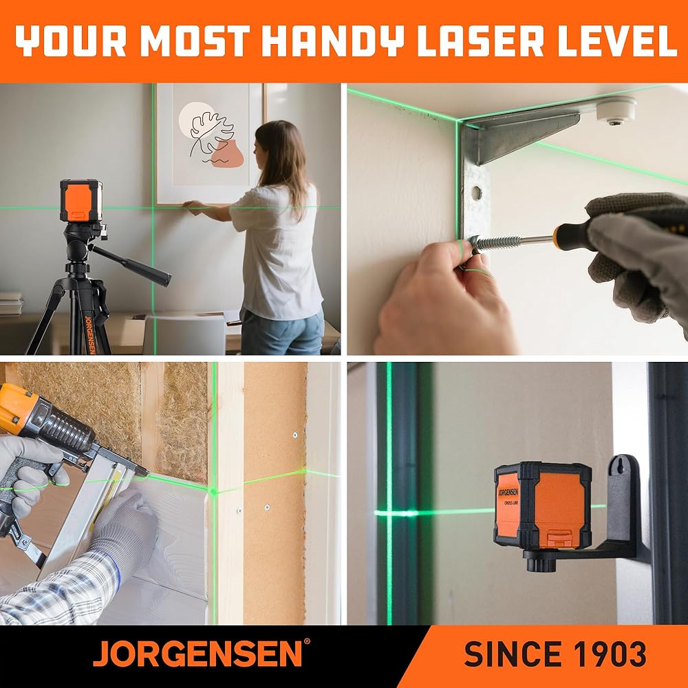 JORGENSEN Laser Level with Tripod, 65 FT Self Leveling Cross Line Laser Leveler Tool with 360° Magnetic Base, Green Laser Level for Picture Hanging, Home Renovation, Indoor Project