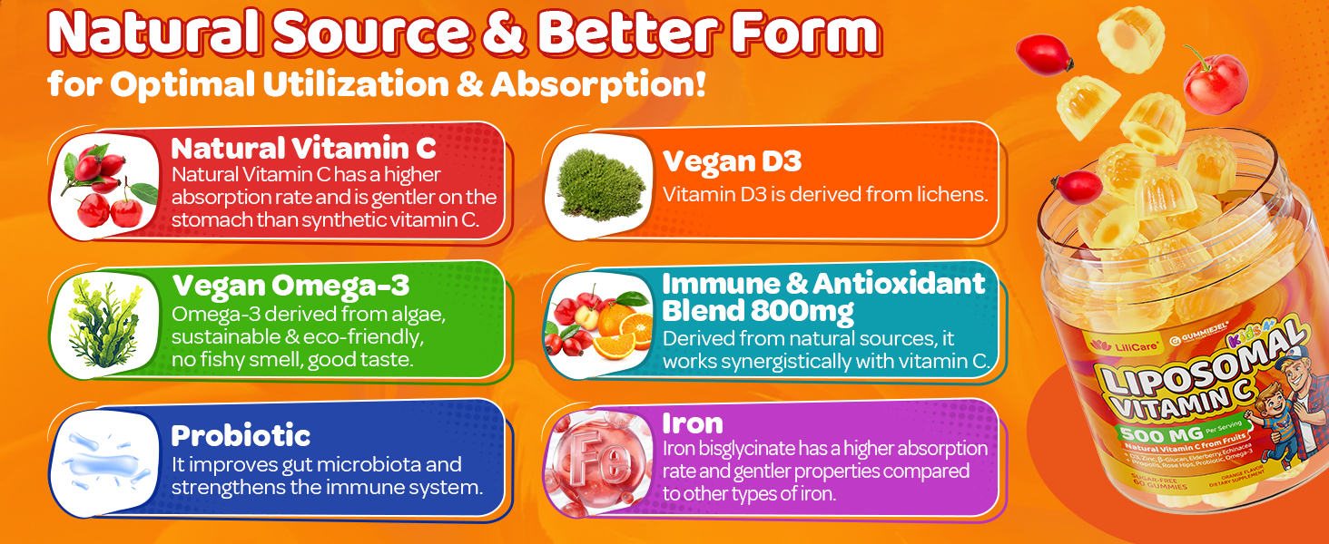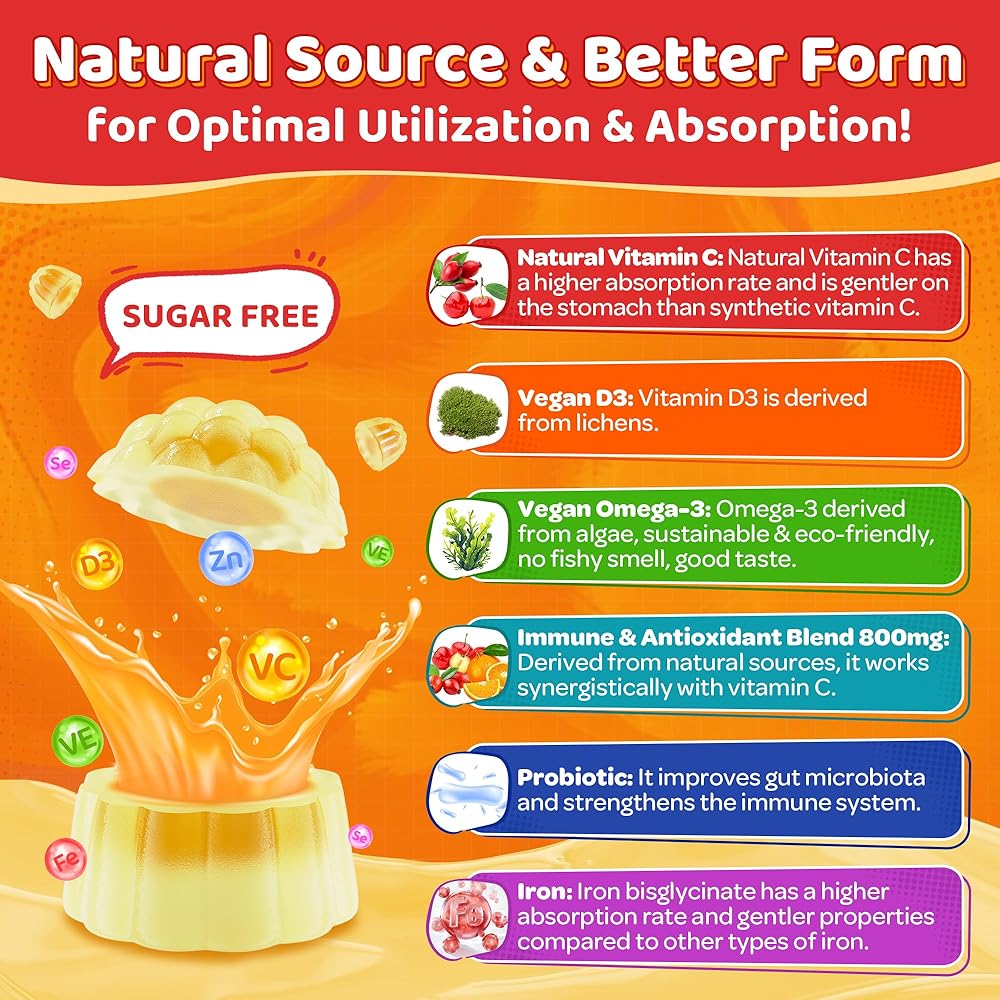 Advanced GummieJel Technology: Our kids Vitamin C Filled Gummies for ages 4+, utilize GummieJel encapsulation technology to protect active ingredients from oxidation. This process locks nutrients within the gummy center, while the pectin-based outer layer shields the internal components from oxidative damage, ensuring sustained efficacy. Product Features: Sugar-free, natural orange flavor, and easy to chew, delivering a superior taste experience.