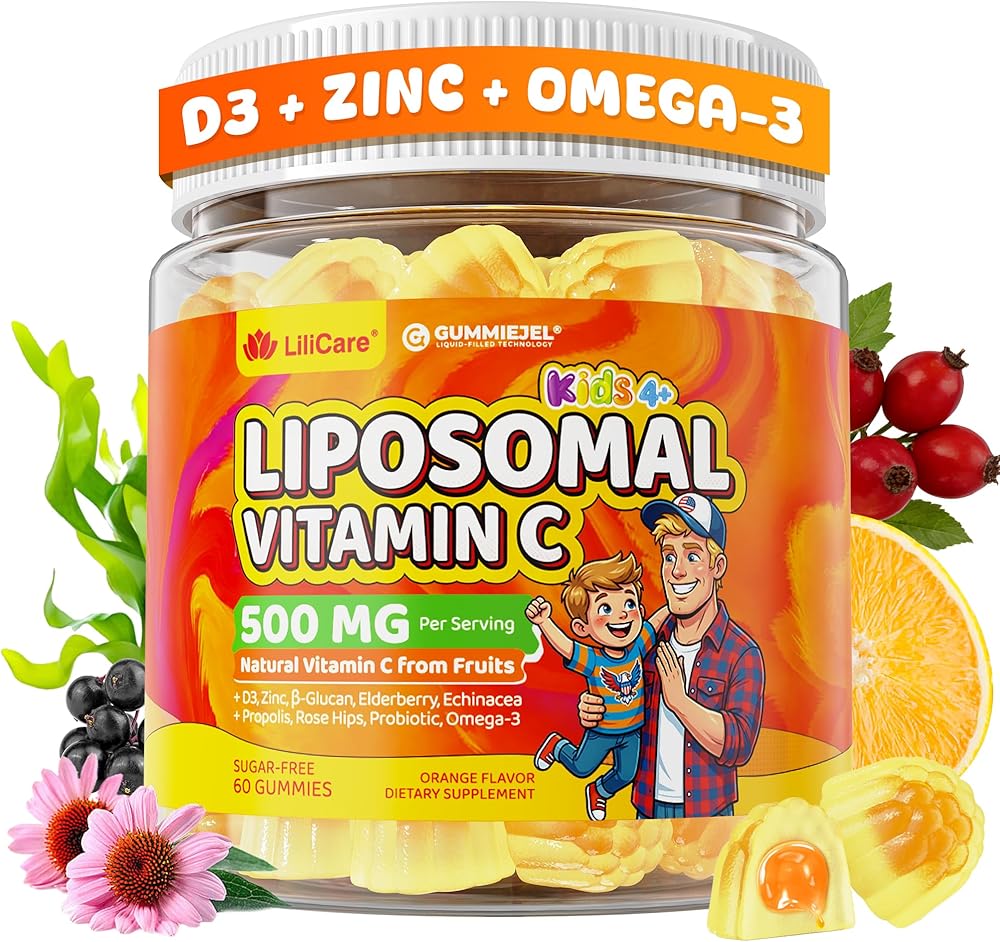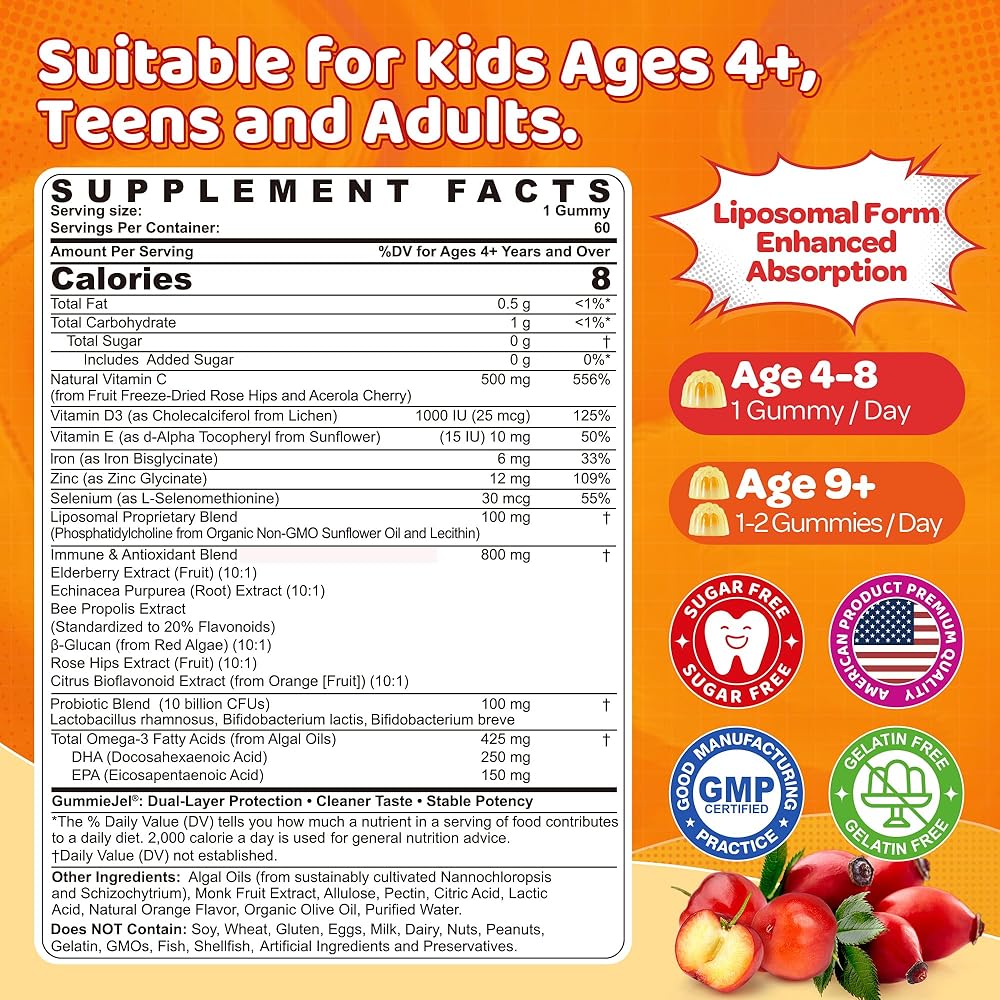 Liposomal Vitamin C 500mg Gummies for Kids 4+ & Adults, with Omega-3, Elderberry, Echinacea, Propolis, Zinc, D3, Chewable Kids Immune Support Gummies, Natural Whole Food Vit C from Fruits, Sugar Free
