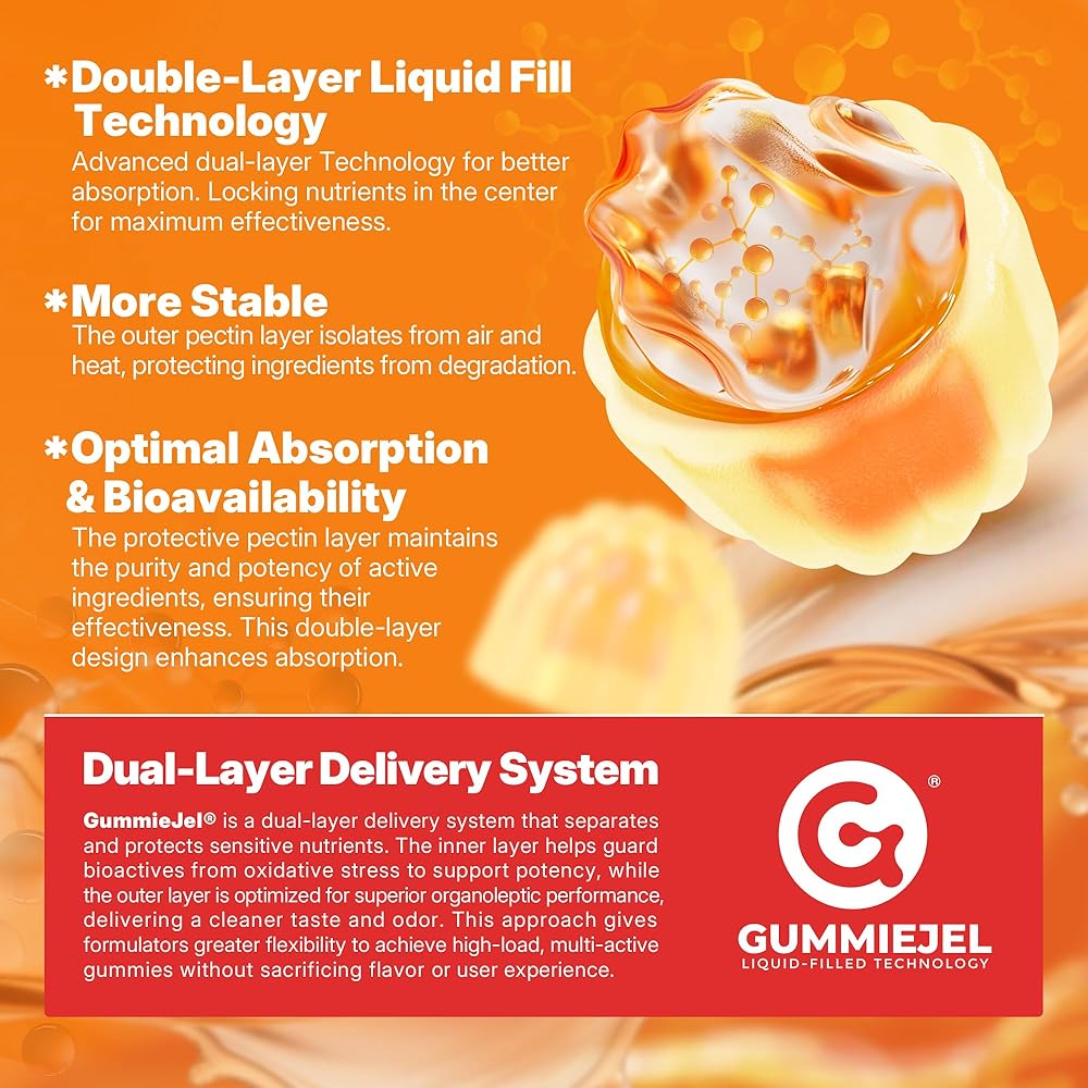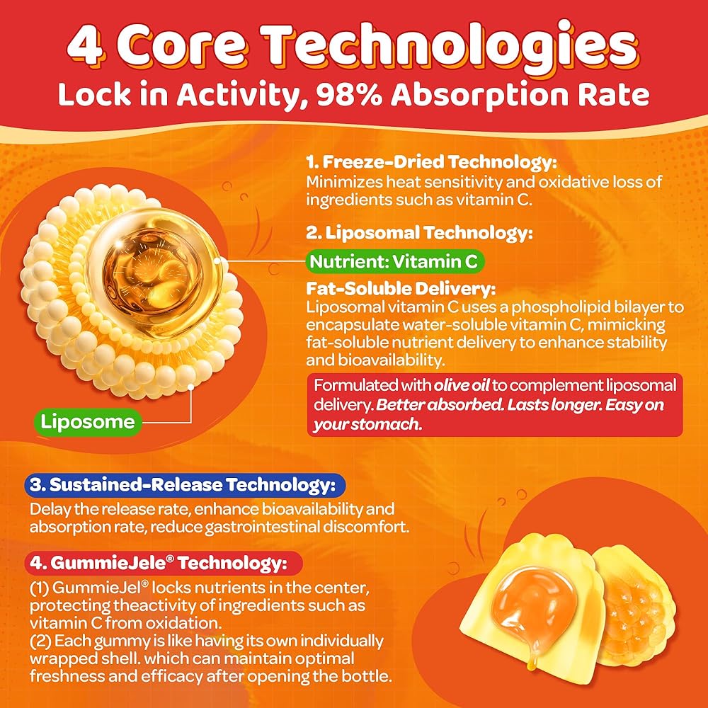 4 Core Technologies - lock in activity, improve nutrient stability, absorption rate & bioavailability: Freeze-drying technology minimizes the he★t sen★itivity & oxidative loss of vitamin C. Liposome technology protects nutrients such as vitamin C from being destroyed by gastric juice. Sustained release technology slows down the release rate of nutrients such as vitamin C. GummieJel technology fills nutrients in the center of the gummy, encapsulating & protecting them from air & high temperature.