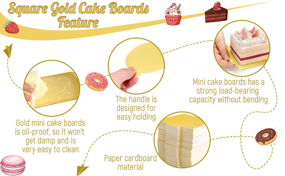 GREASE & MOISTURE PROOF:Mini gold cake board is oil and moisture resistant, freezing durability. Disposable and easy to clean