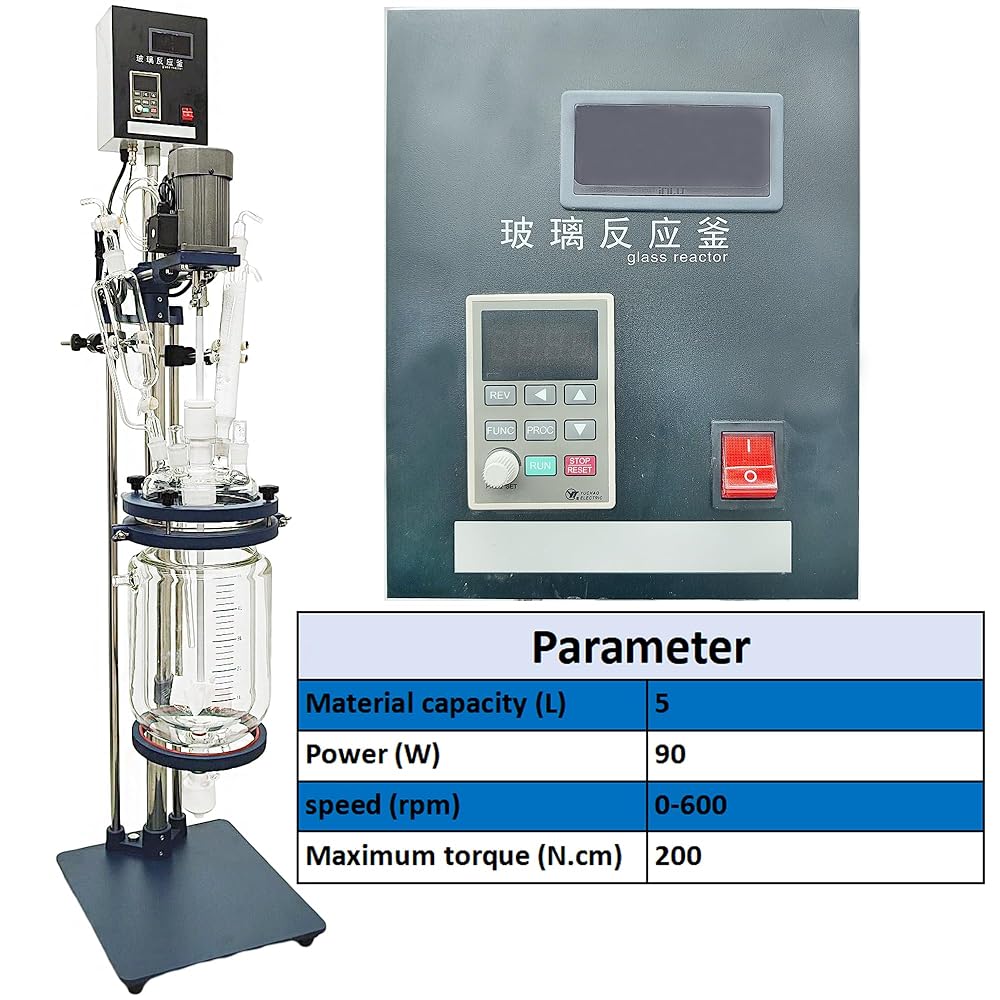 Glass Reactor 5L Chemical Glass Jacketed Vessel for Reaction Distillation Digital Display Double-Layer Lab Reactor with Support Frame Adjustable Speed for Lab Reaction Distillation 220V