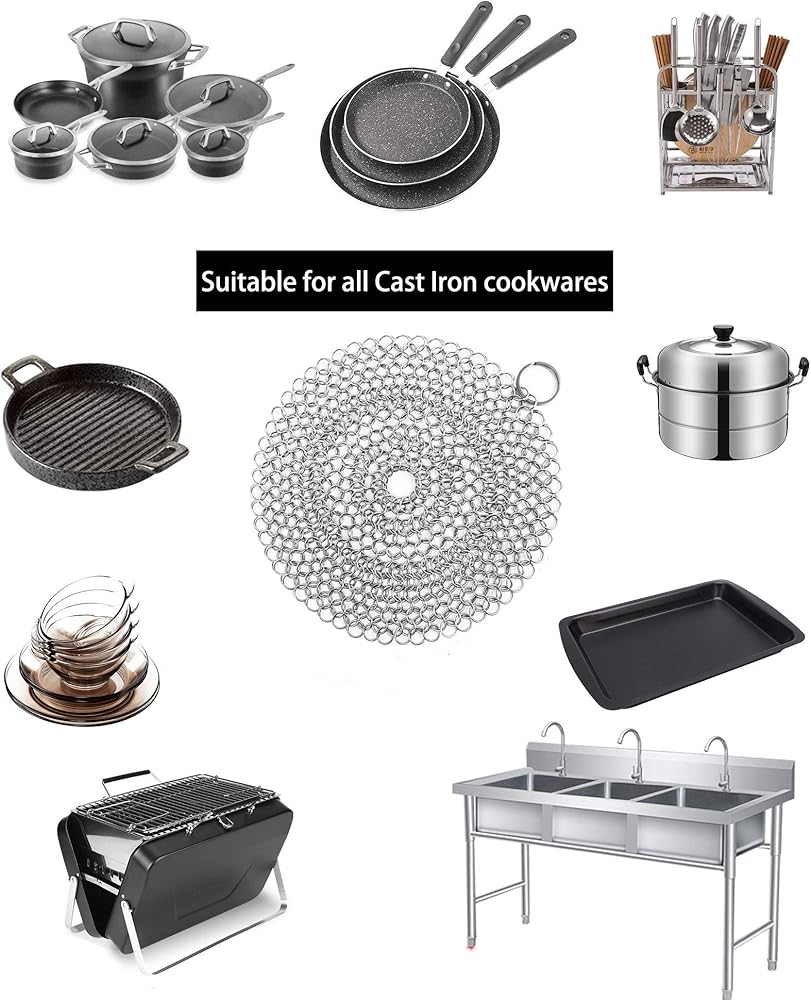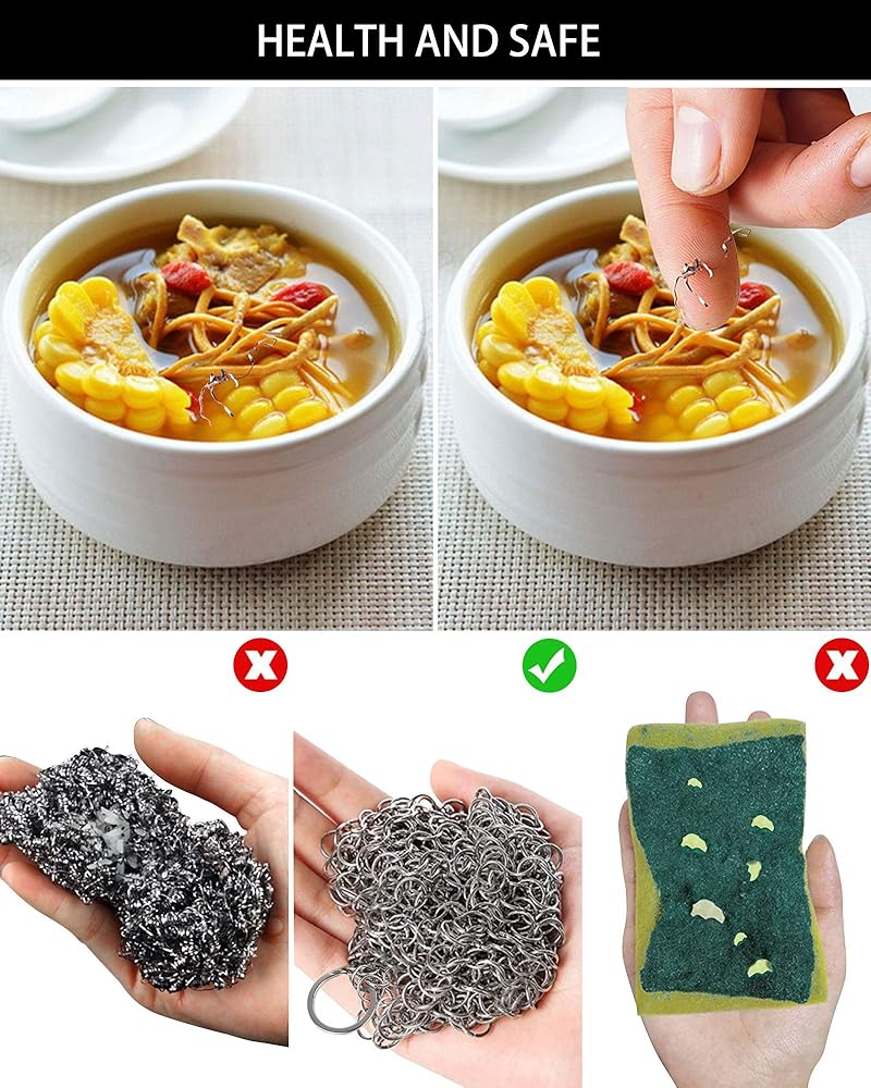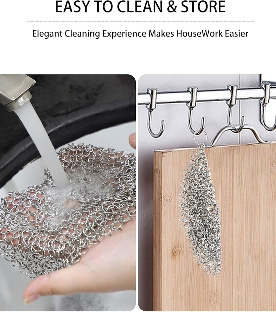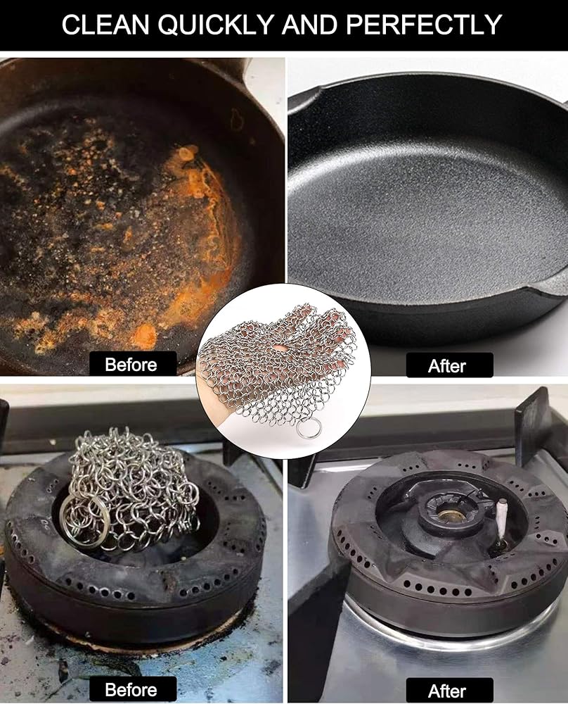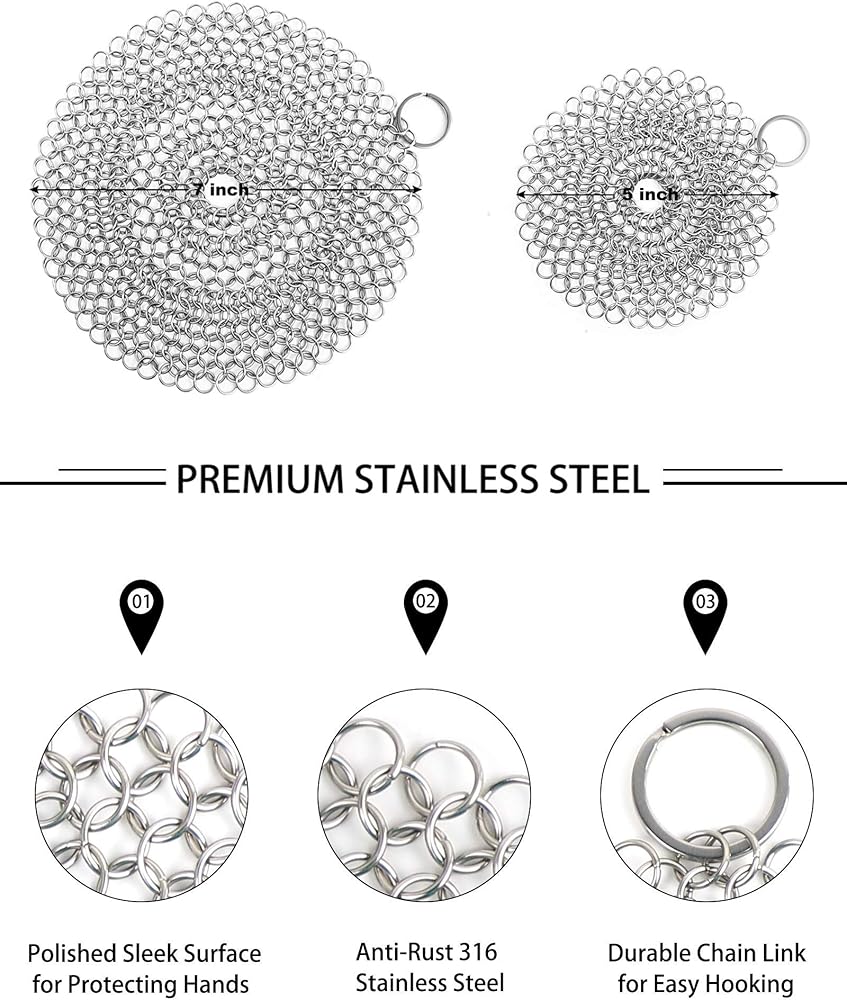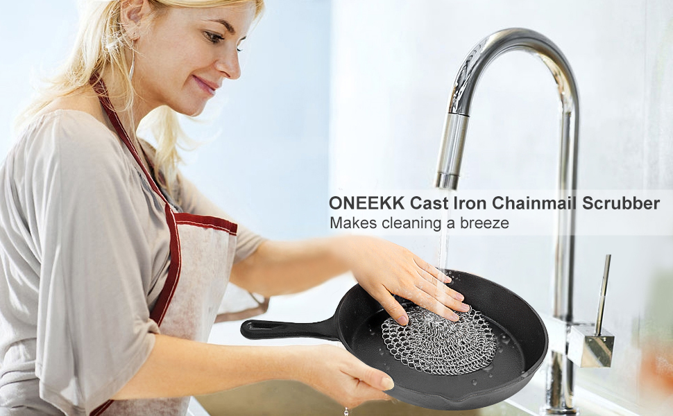 【CLEAN QUICKLY AND PERFECTLY】ONEEKK cast iron skillet cleaner is made of Premium 316 stainless steel smooth ring, chain mail link design, lock and scrub stubborn stains efficiently, helping you effortlessly clean cast iron cookware without compromising the seasoning. Chain mail to clean cast iron residue with warm water which will release quickly and easily. No soap or harsh detergents needed